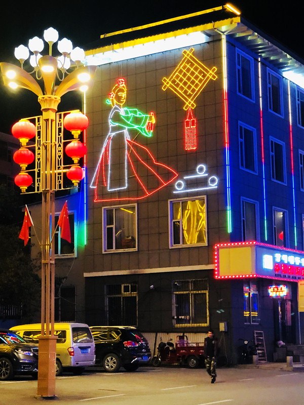 为了欣赏小城灯光,吃饱饭我们冒着5度的寒冷,步行回宾馆,边走边欣赏这座中朝边境上的小城风光。最让人赏心悦目的是,将朝鲜族舞蹈搬上了墙上,以灯光的形式展现出来,活灵活现。
