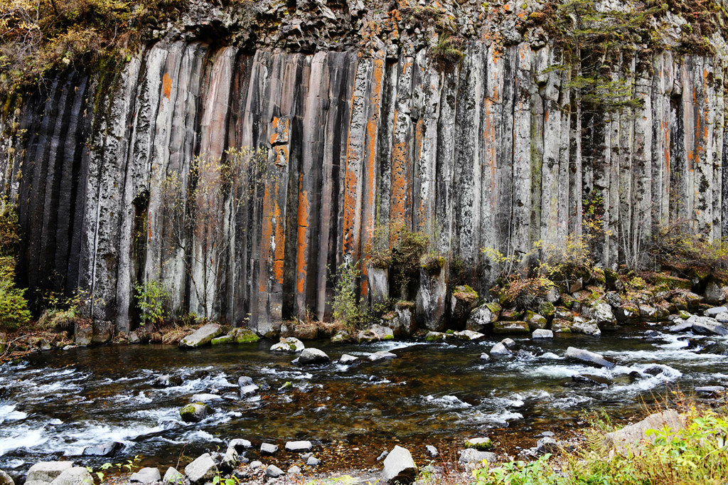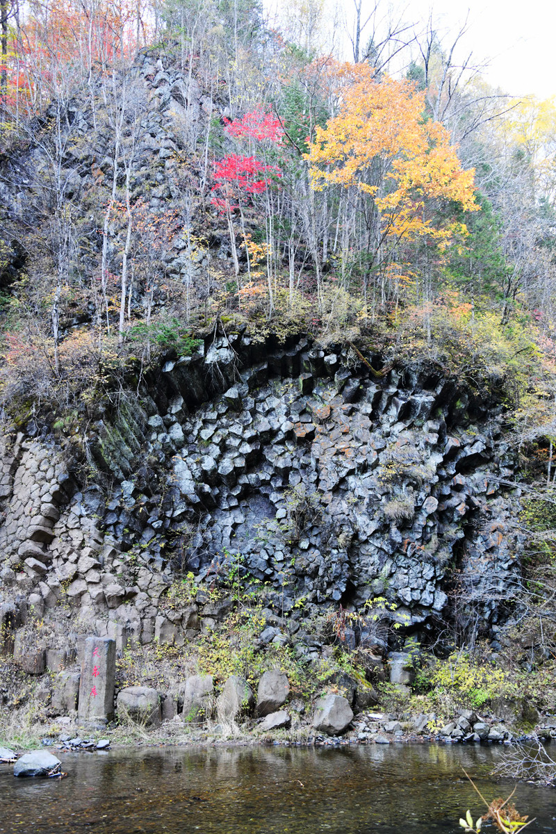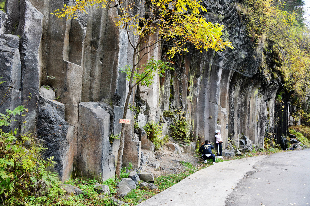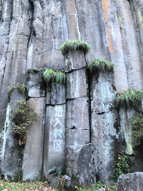 该景区另一特色是它的玄武岩石,在冰岛曾见过。据说望天鹅山峰是一个巨大的中心式喷发和溢流的玄武质火山堆,是一个巨大的破火山口,沟内因破火山作用形成的火山地址遗迹和景观非常独特。这些灰色或黑色玄武岩,多呈四棱或六棱体,形成的紧密柱状排列如一片石林,放射状排列如牵手观音,横向排列的如天梯,还有成堆被挤压排列的如摆放好被压进大山里仅露出头端成千上万的枕木。世界真的太奇妙了!