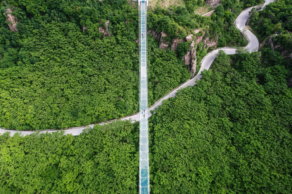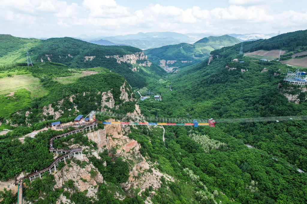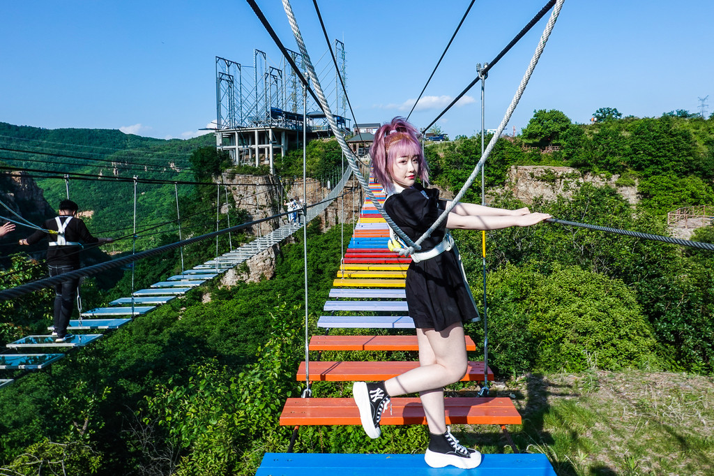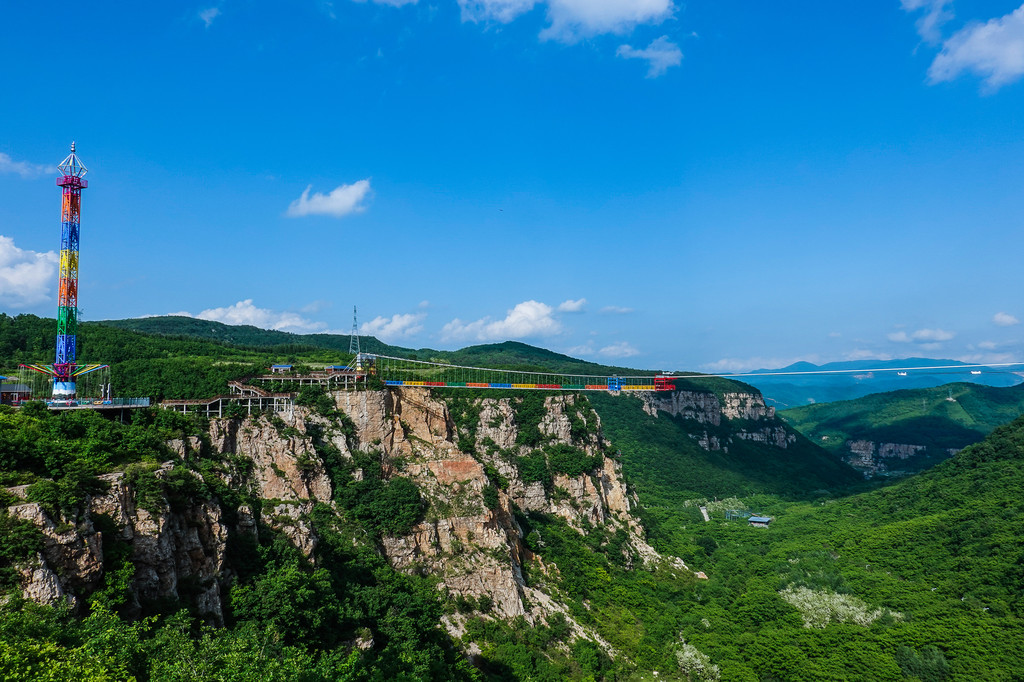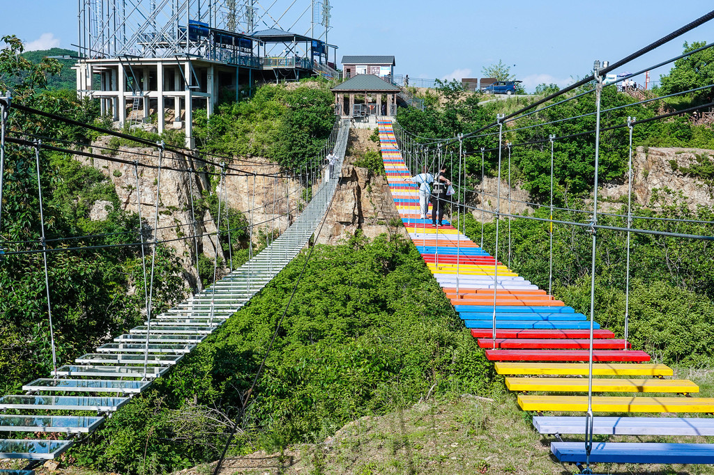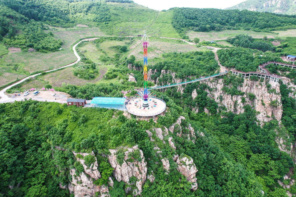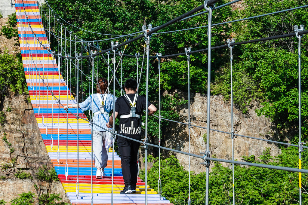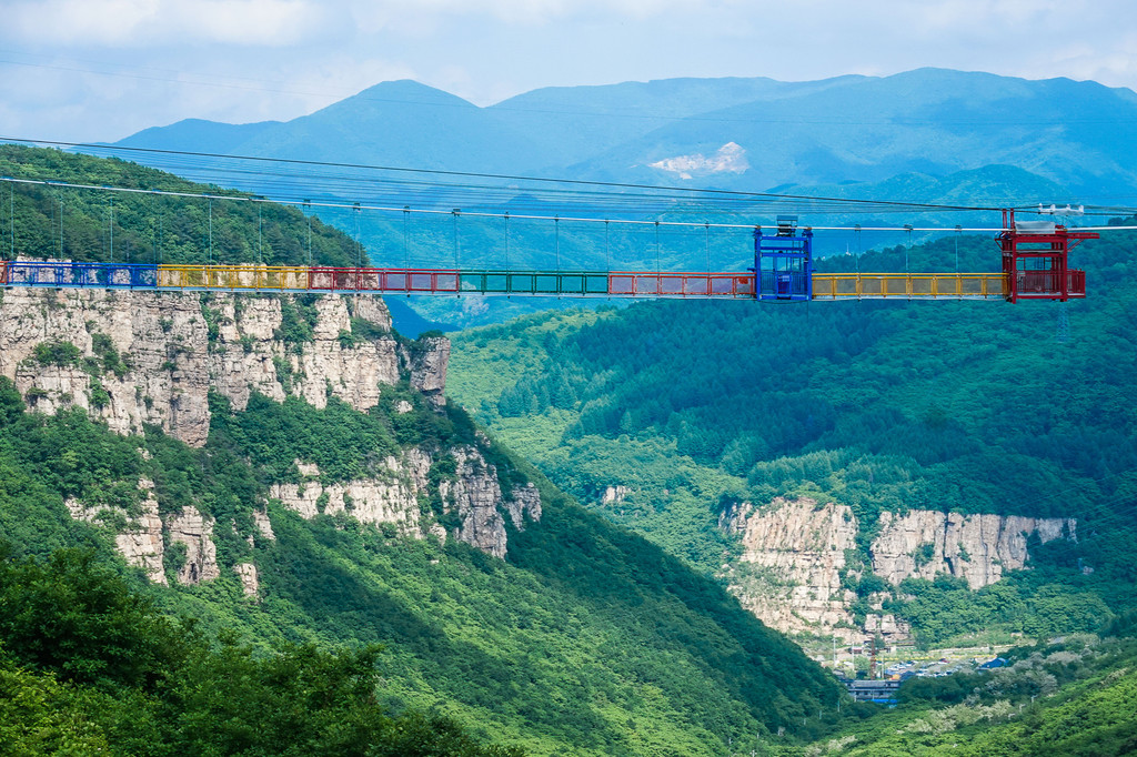 玻璃悬索桥是东北地区最长最壮观的玻璃吊桥,在山两边架设铁索,铺上玻璃,走在上面,真的是步步惊心。长369米,最高落差158米,透明玻璃铺设,相当于在52层楼高上行走。一低头就是悬崖山谷,一抬头就是蓝天白云。
