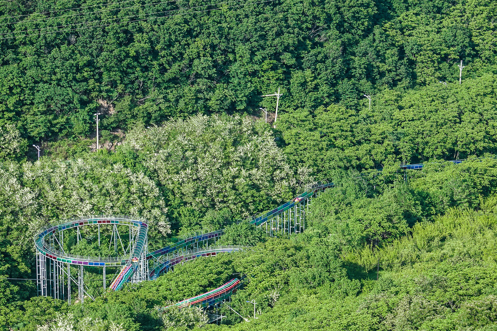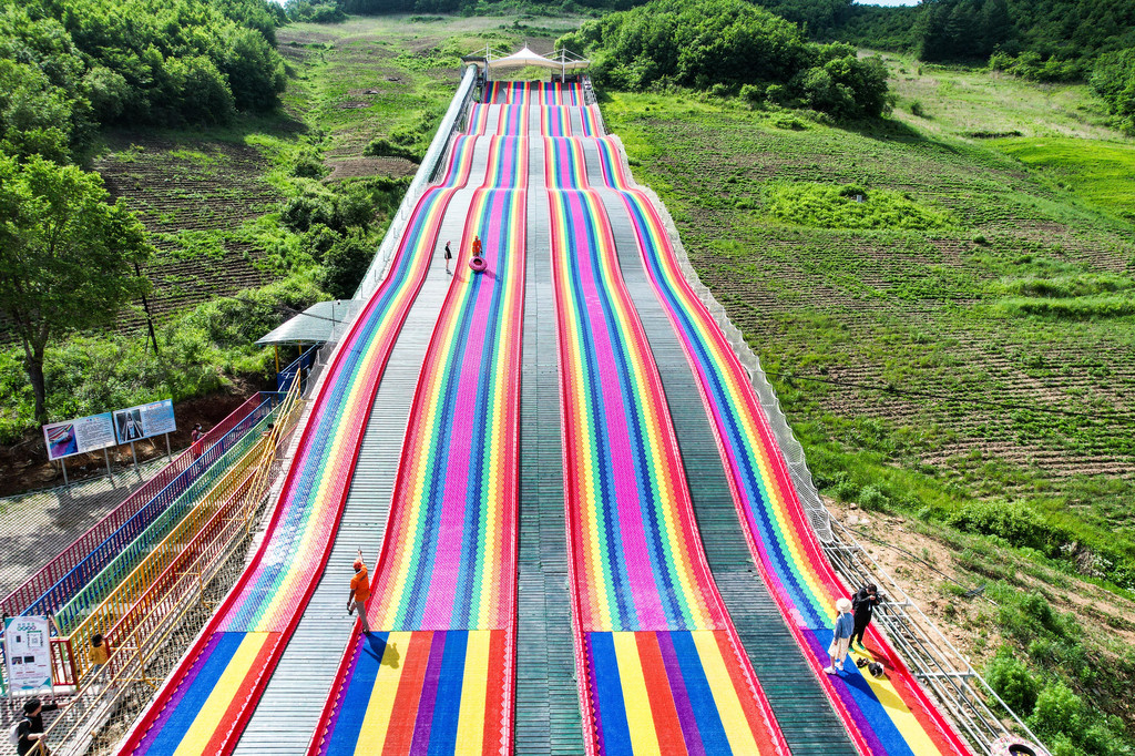 彩虹滑道,仿佛一条彩虹挂在山坡上,谁又没有一个在彩虹上大滑梯的梦呢?