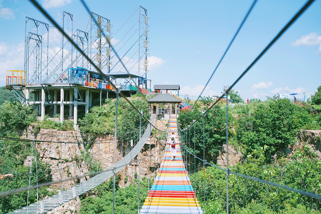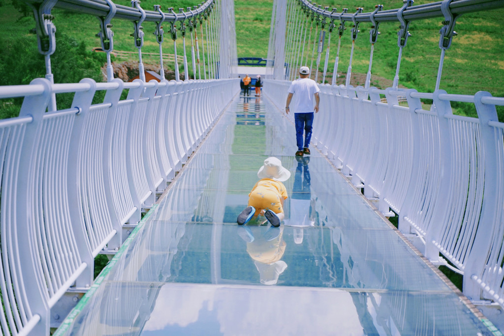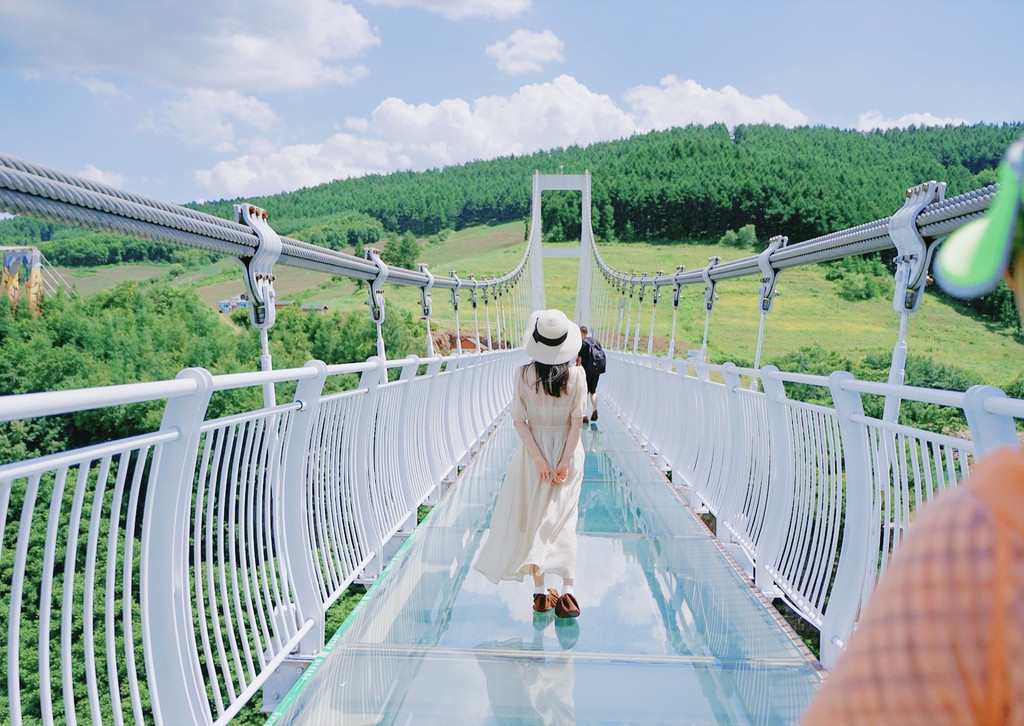 矗立于景区山顶旁的 东北 第一桥,玻璃吊桥采用透明玻璃铺设,全长369米,宽3米,最高落差158米,相当于52层楼高,走在桥上相当刺激。