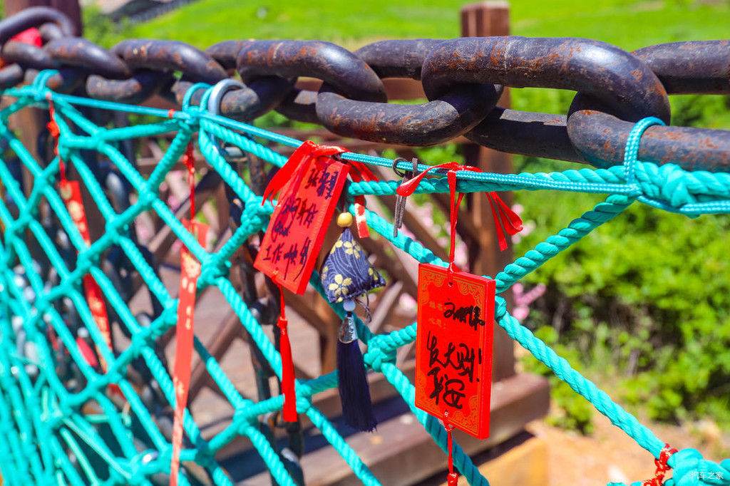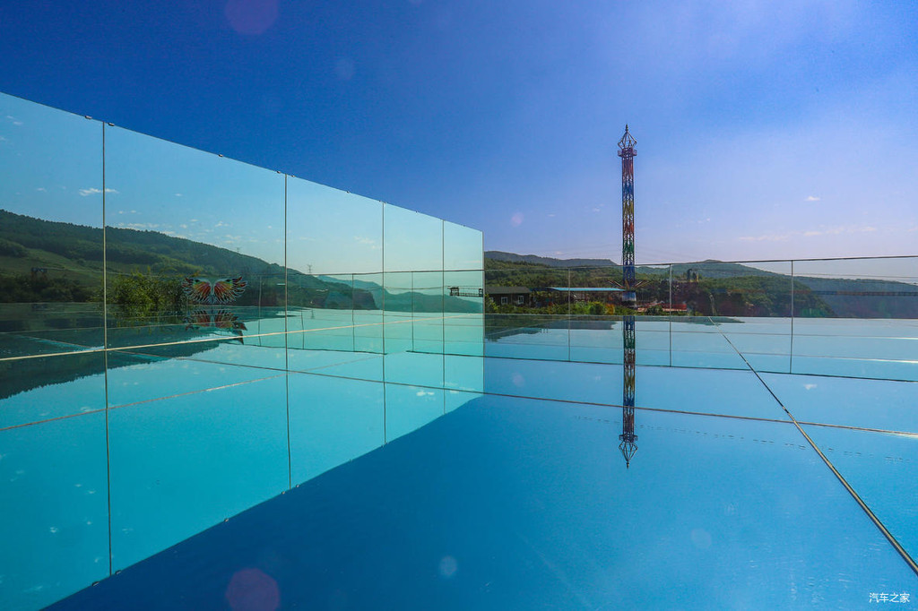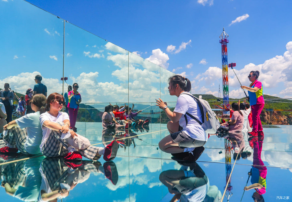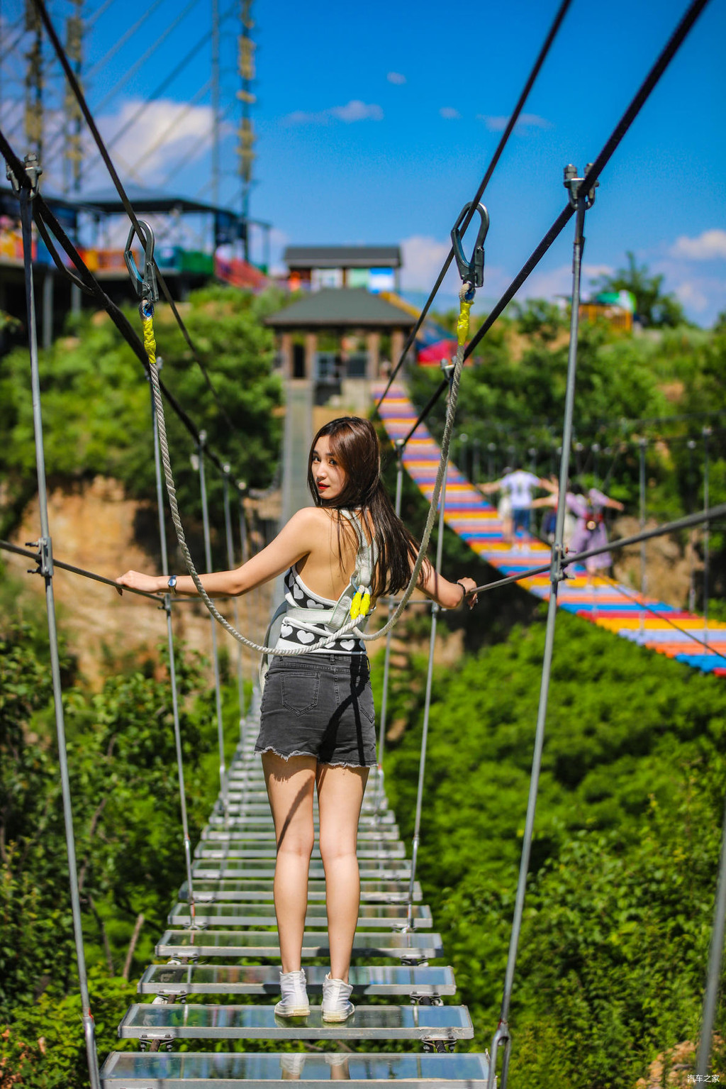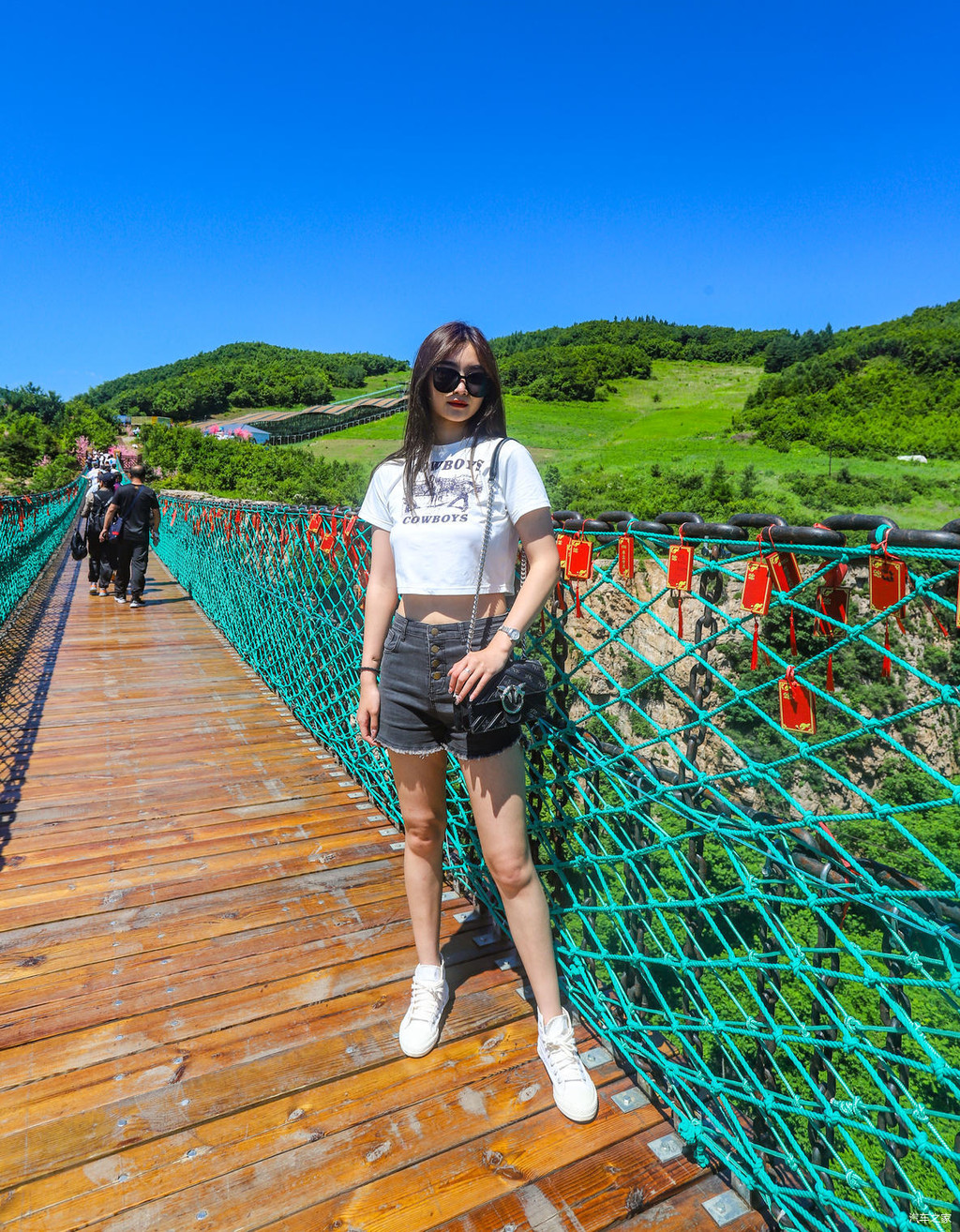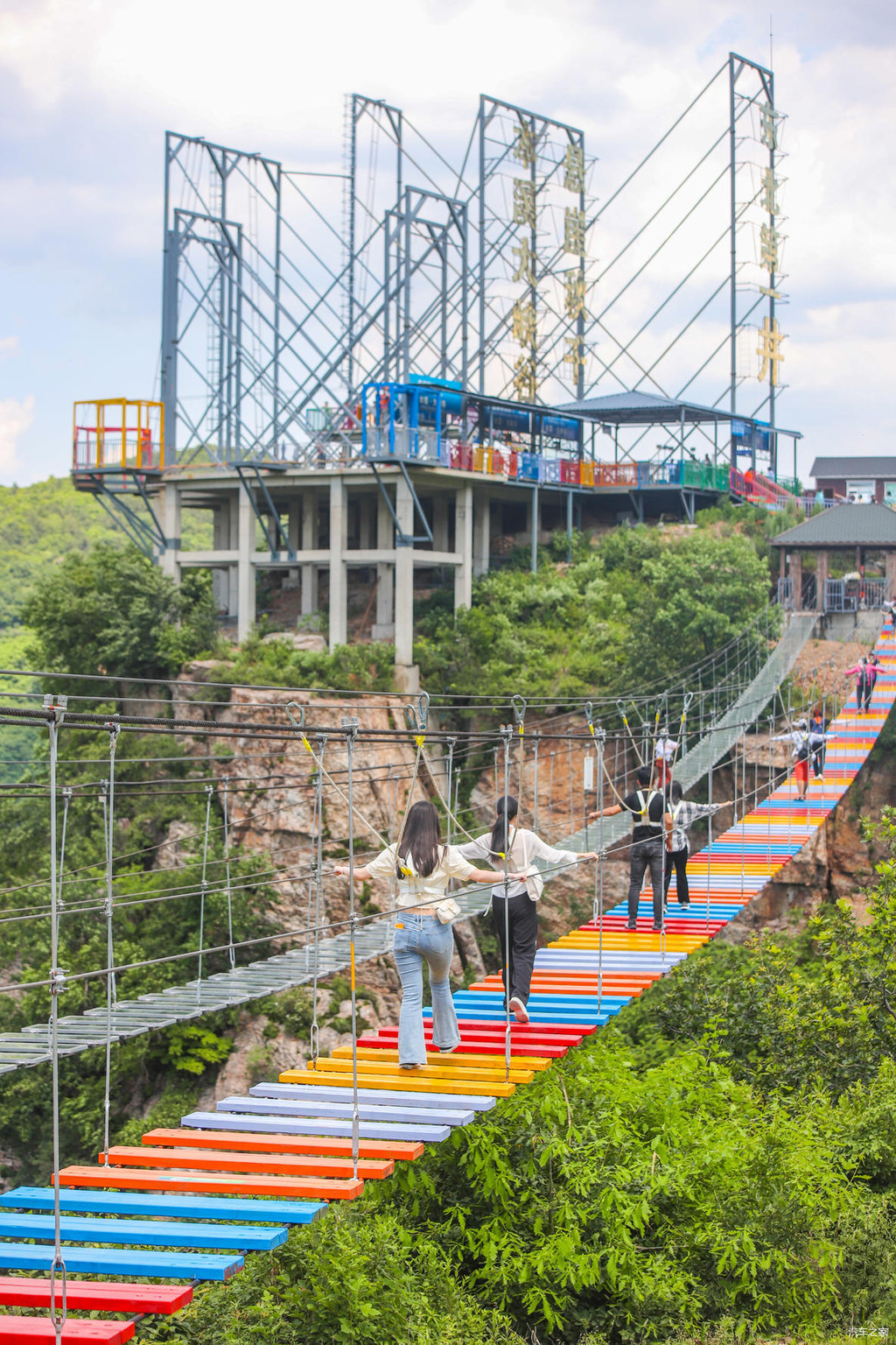 继续前行就是五福桥,这座铁索桥上悬挂着很多游客写下对亲朋好友或是恋人的祝福。穿过铁索桥,就抵达了一片游玩区域,这里有高空飞椅、七彩滑道、天空之镜以及玻璃吊桥等等的体验项目。穿上鞋套,与朋友们在天空之镜上各种互拍,氛围超级nice!