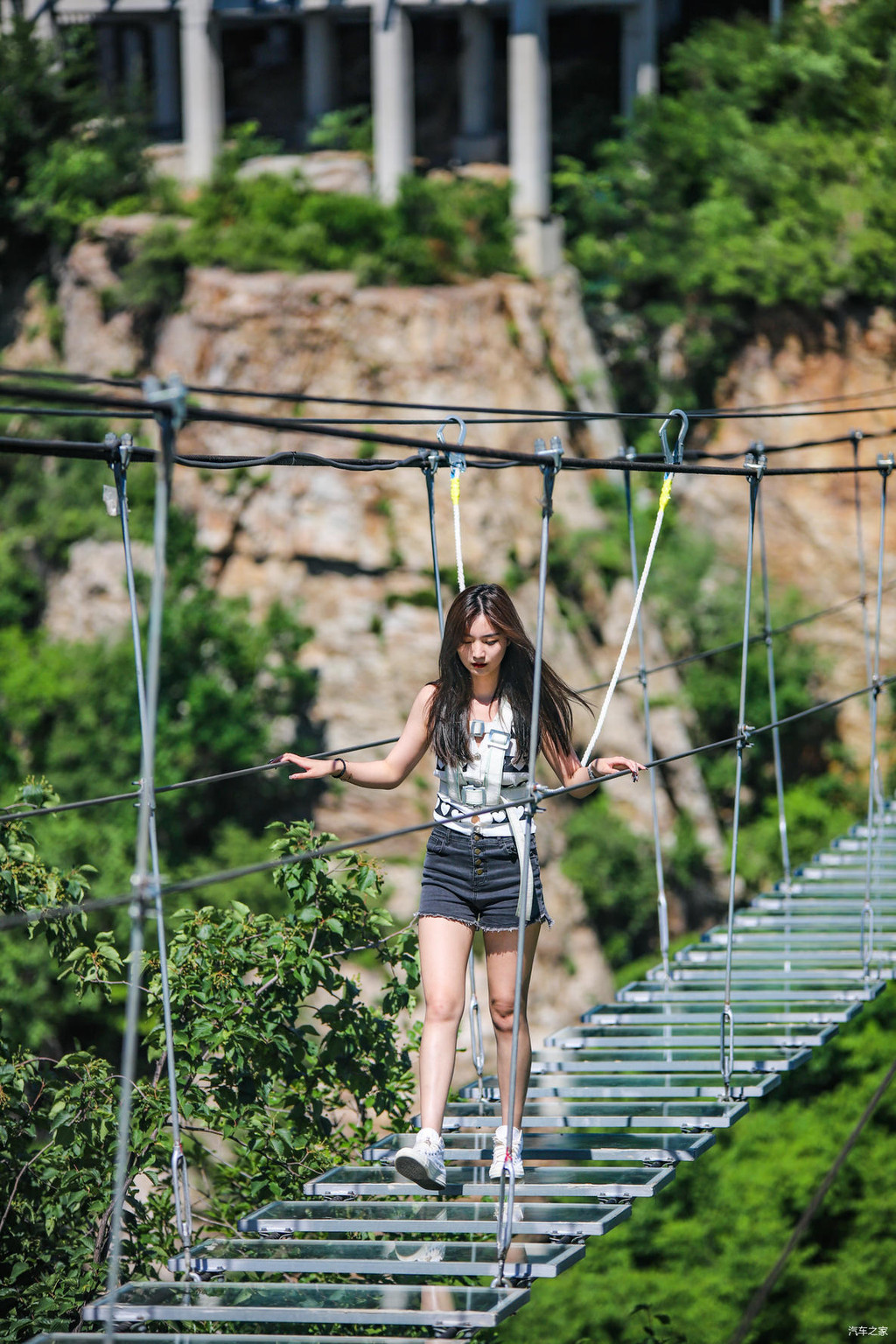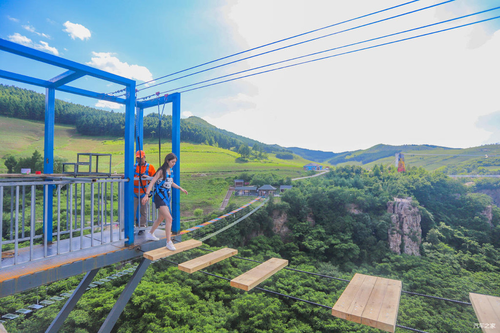 悬崖秋千一旁是步步惊心,顾名思义,体验者在穿戴好安全设备以后,踏过一组组临空而建的踏板,成功抵达对岸,才算是挑战成功。