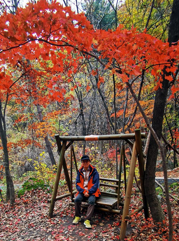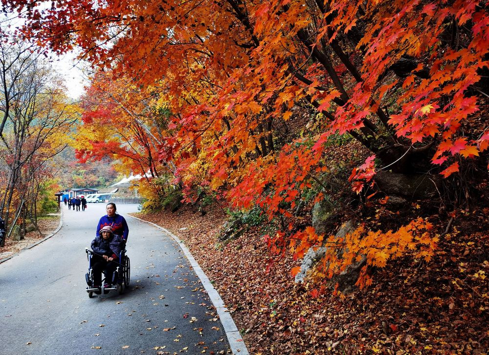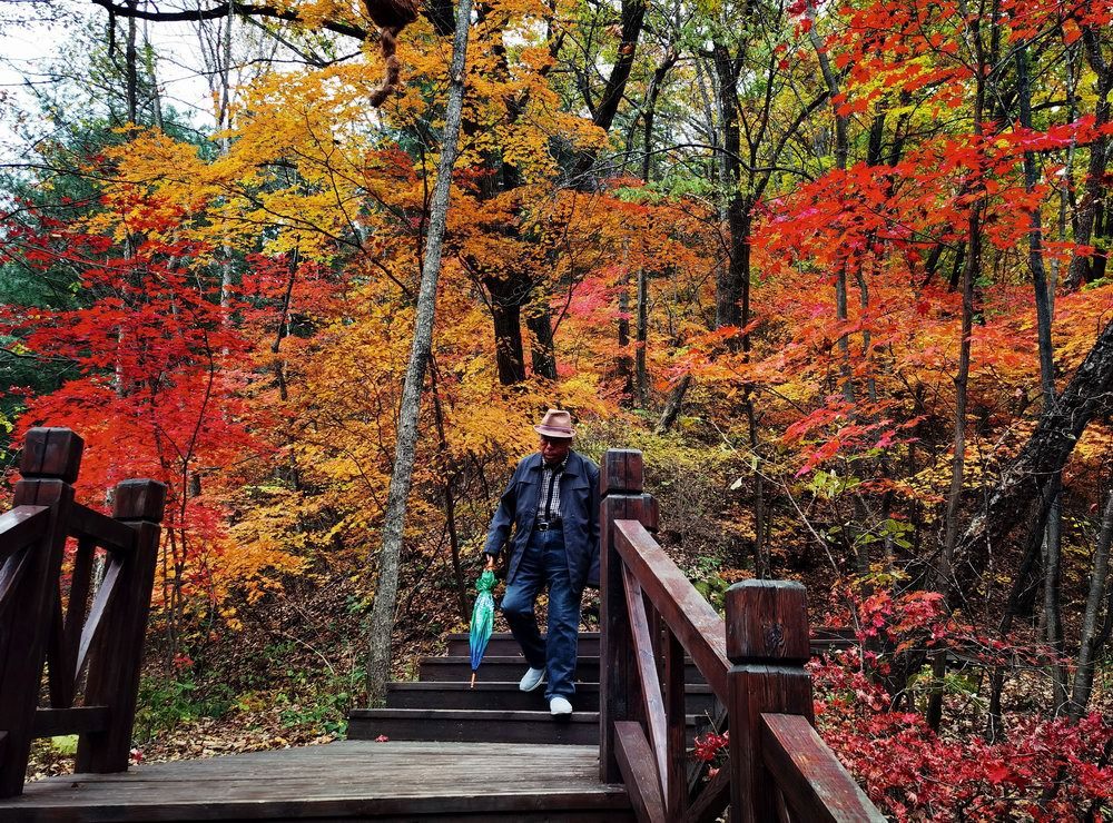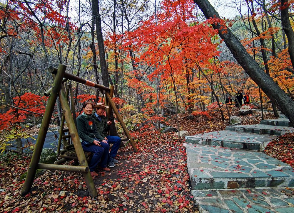 进入大冰沟森林公园,秋色已经很浓了。有的老人坐着轮椅来游园。