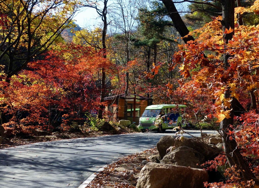 大冰沟森林公园坐落在本溪市东南35公里的南芬区思山岭乡境内,从本溪市出发,走一站沈丹高速公路,在桥头出口下道,然后走大约20公里的省道和乡道就到了大冰沟。图为本宽公路通向大冰沟的停车场。