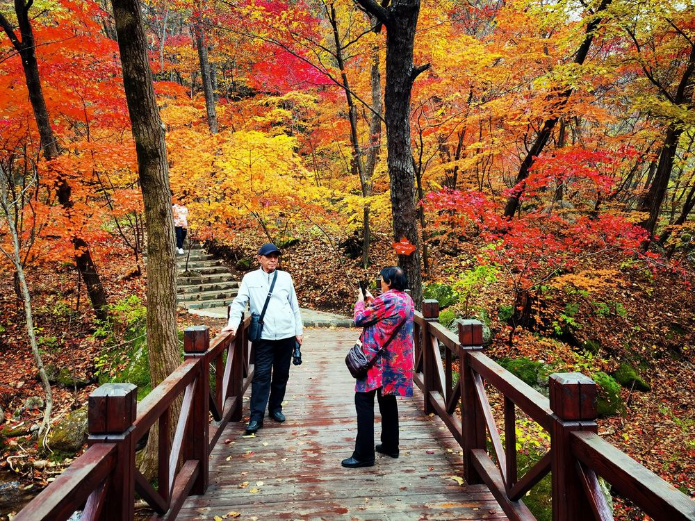 木栈道旁,万山红遍,层林尽染,游客们纷纷停下来拍照。