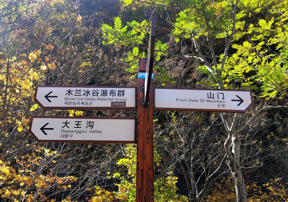 大冰沟,顾名思义,因常年有冰而得名。这里气象独特,加上森林掩映,常年低温寡照,瀑布在冬天形成的冰瀑直到来年的夏天才逐渐消融。图为大冰沟公园的指路牌。
