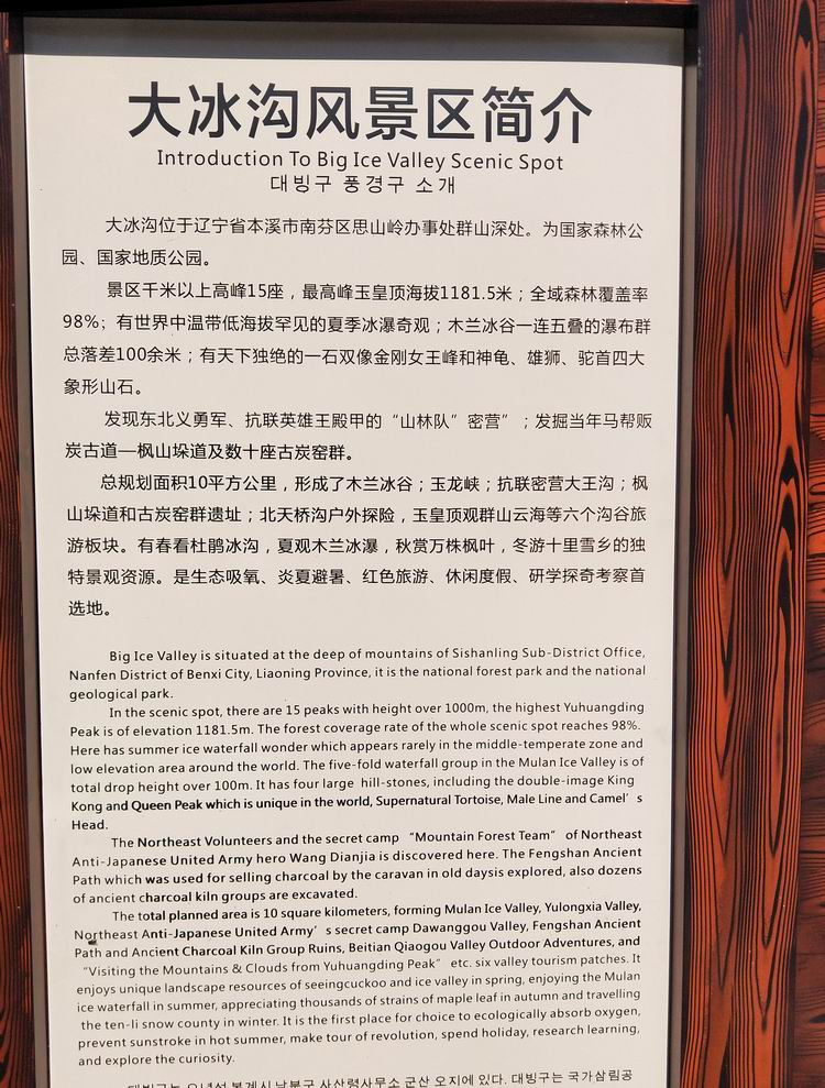 大冰沟景区总面积85平方公里,森林覆盖率达86%。景区内有东北最大的九裂极品红叶枫王和天女木兰花群落。图为大冰沟景区简介。