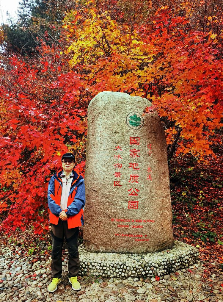 大冰沟景区群峰竞秀,林茂水丰,瀑飞溪涧,枫红秋谷,飞禽走兽,奇花异草,野果飘香。是生态旅游、度假、探奇和科学考察的好去处。图为我在大冰沟景区国家地质公园石碑旁拍的纪念照。