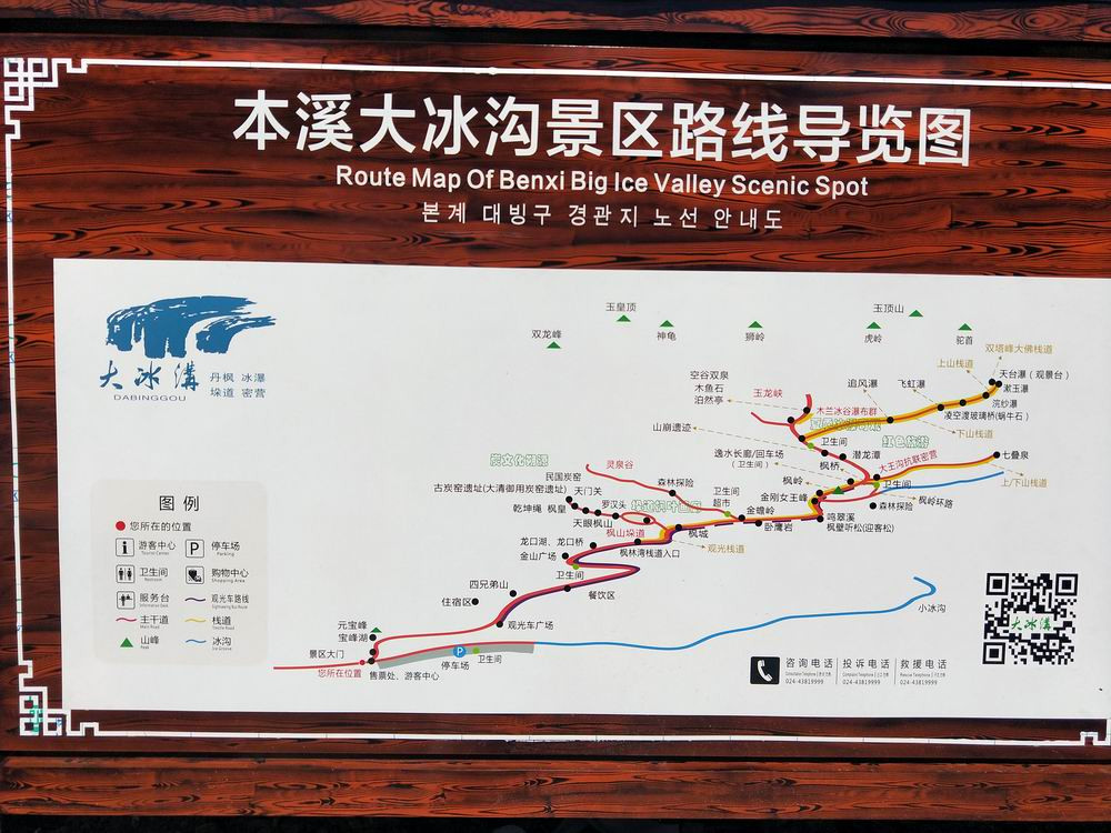 大冰沟森林公园内,有玉皇峰、溪涧瀑布、五连池、卧龙湖、佛手峰、天女峰、仙人台、雷公塔、连理树、夫妻树、落泪坡、大冰沟天桥、天女木兰花丛和枫王台等景点多处。图为大冰沟景区导览图。