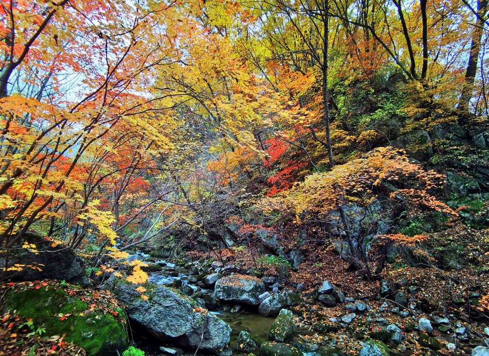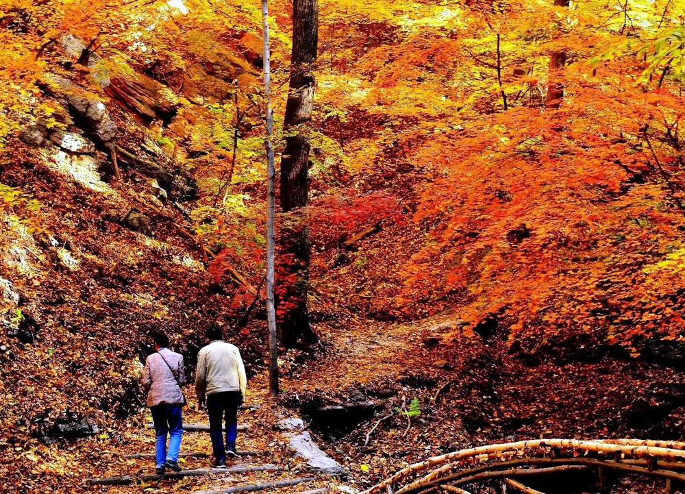 进入大冰沟腹地,映入眼帘的是大片的原始森林,这里的森林覆盖率达86%。97.这里有东北最大的九裂极品红叶枫王和柞树、紫椴、黄菠萝等五颜六色的植物。大冰沟不愧是本溪赏枫景区的后起之秀!