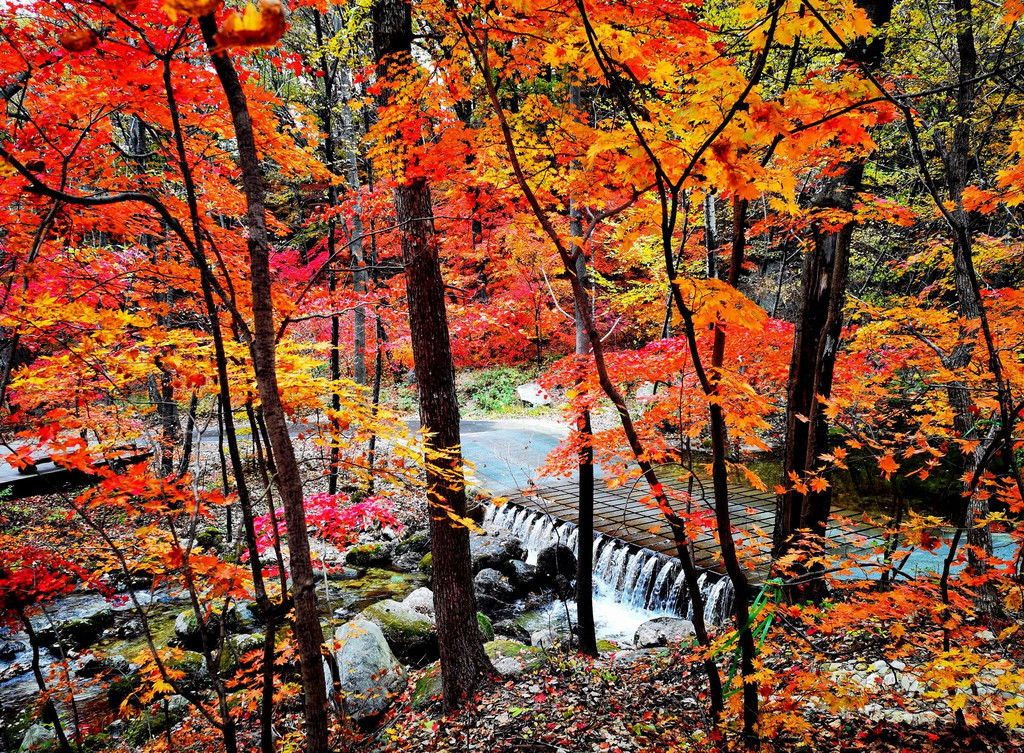 小溪边修了木栈道,木栈道两旁的枫叶正红。