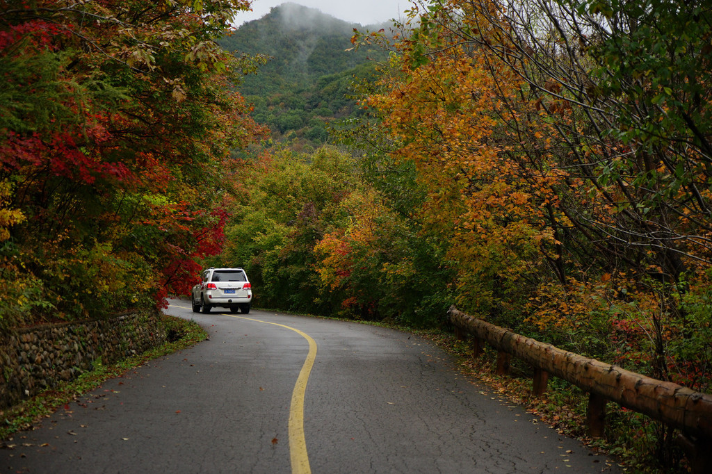 汽车驶入了森林公路,两边一簇簇一片片的红色黄色绿色,顿时让人一阵惊呼。