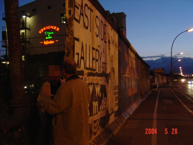 虽然没时间去柏林其它景点看看,想起来开幕式上的舞蹈柏林墙的倒塌,就想试着能不能找到柏林墙来看一下。那里还没有在线地图那么方便,找地方全凭嘴问。看路上行人匆匆,就随便找了一位中年绅士来问路。中年绅士先是试图在地图上给我们讲明白道路,但看我们似懂非懂的样子,没想到中年绅士二话没说,很热情地直接把我们送到了柏林墙的位置,还热情地给我们讲解了一些相关的情况。