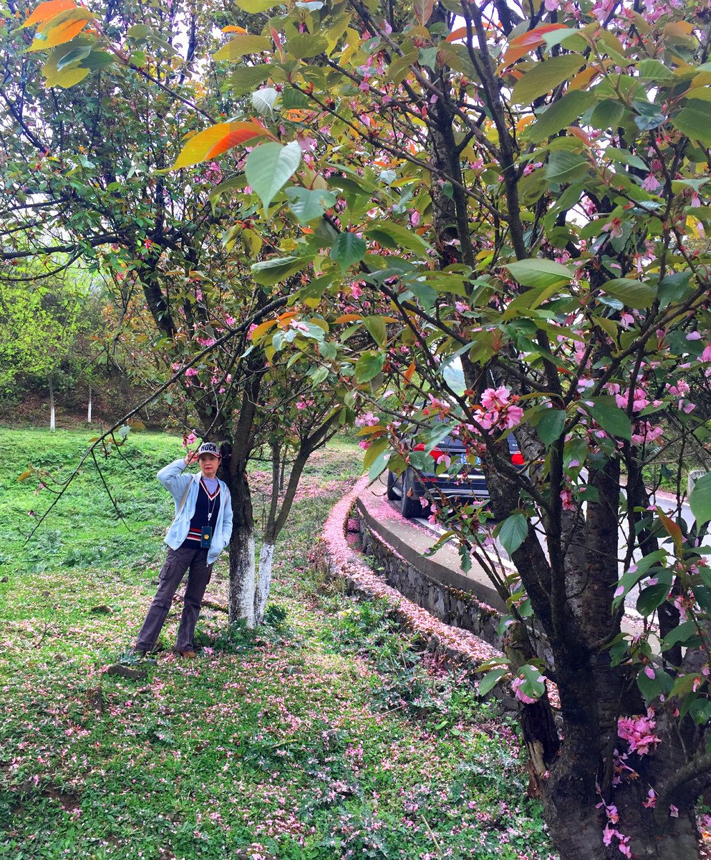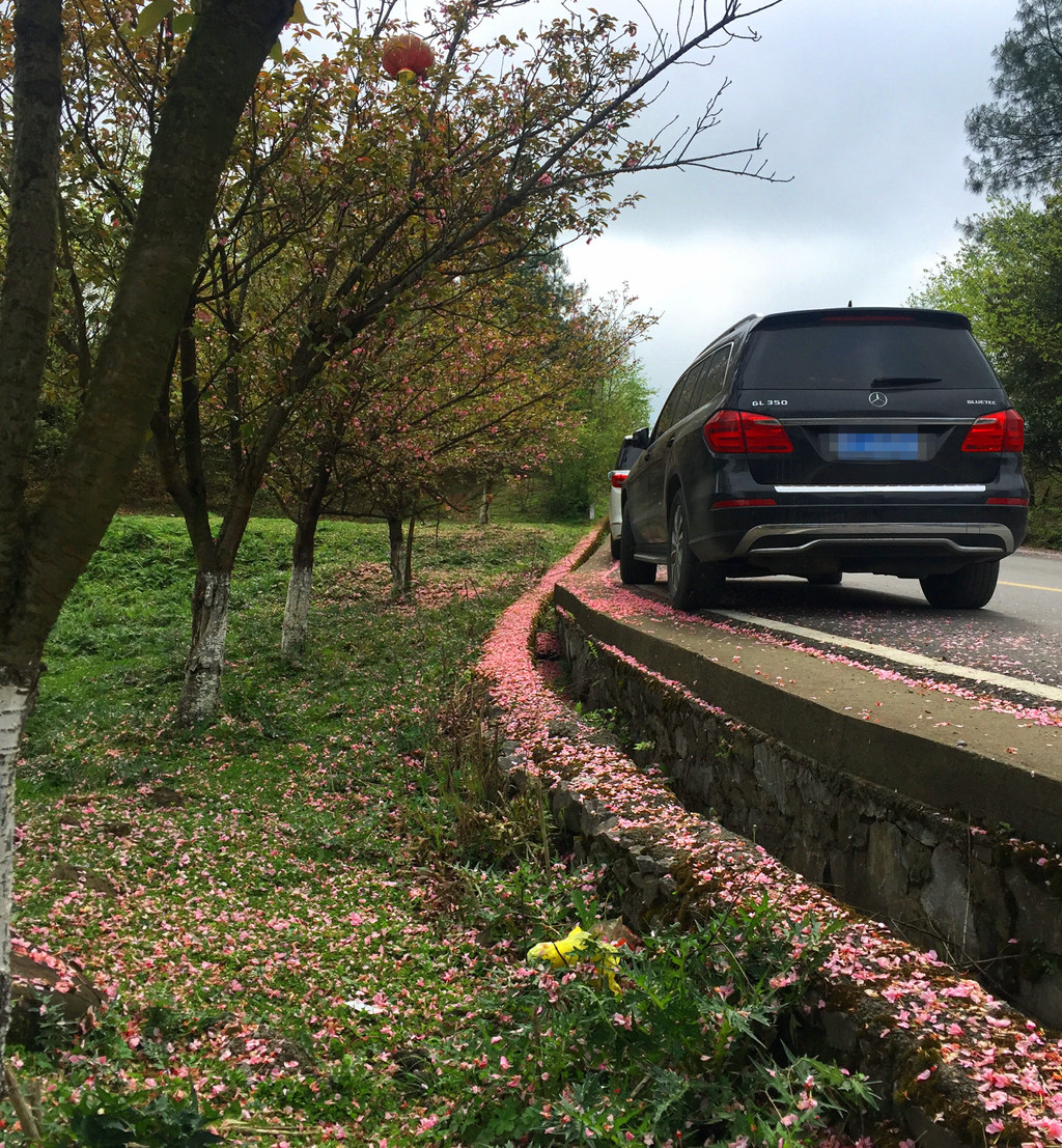 下山路边居然发现一小片樱花林,樱花洋洋洒洒落了一地。百里杜鹃看樱花,有点牛头不对马嘴。将就吧,有花看总比没花看要强上那么一点点。