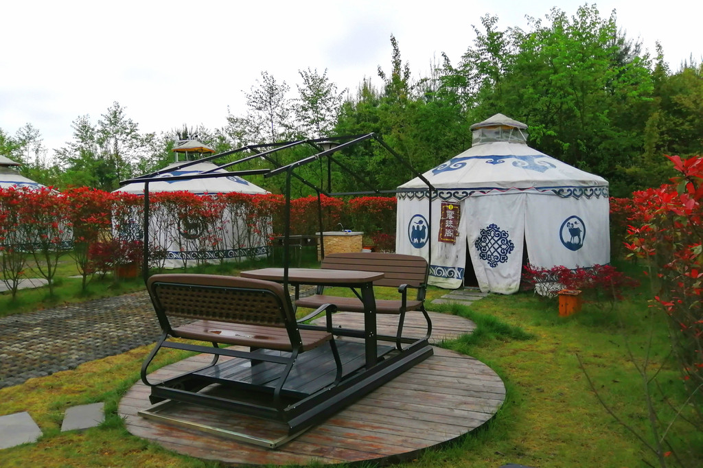 离“樱花路”不远有个小高山草原,忍着脚痛走栈道进去游逛。草原面积不大,极目望去只能算是草坝子。有不超过一只手的几个人影晃动,矗立着几顶蒙古包,里面堆放着烧烤架、座椅板凳,原来是一个烧烤营地。