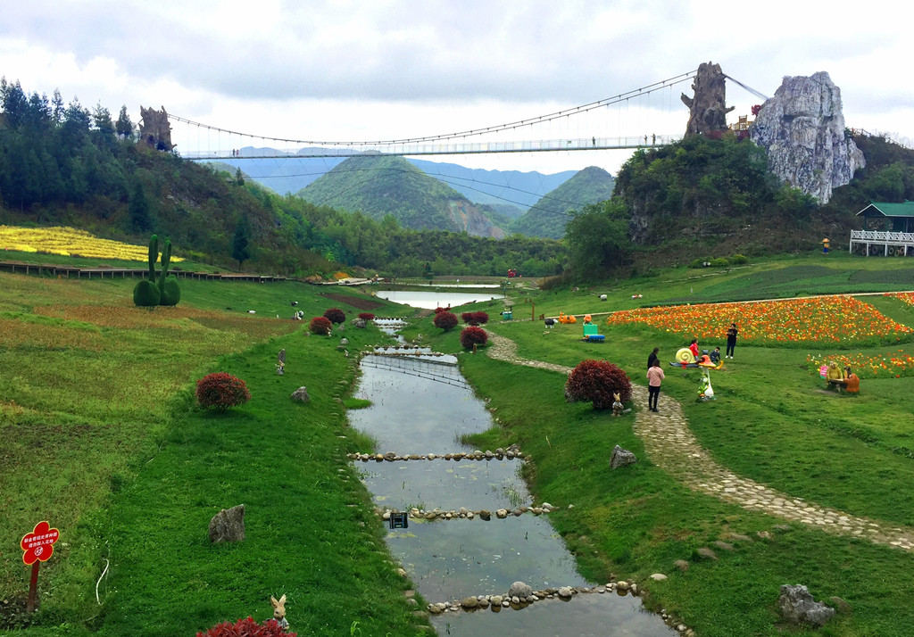在彝山花谷还有一处重要景观:玻璃吊桥!可惜此桥低而短,严重缺乏紧张刺激感,稀奇一下算了,没有什么体验价值。但是放在整个景区大环境内,其观赏价值还是很不不错。