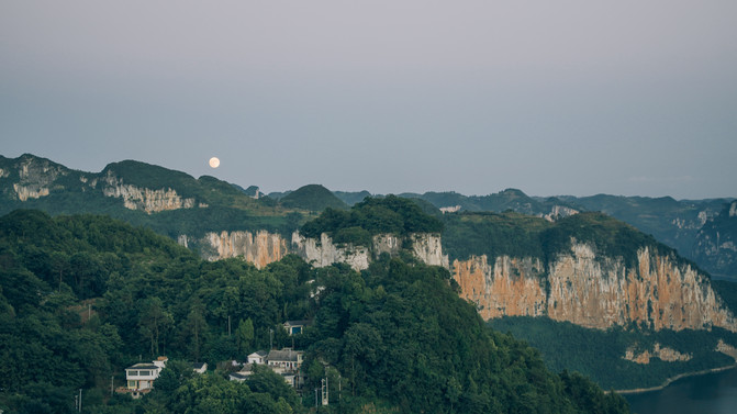 驱车回到山上,远处的山脉因为光线不足已经开始模糊。山头有一轮明月,又大又圆。我们来的这一日刚好快到中秋了,月圆人团聚。