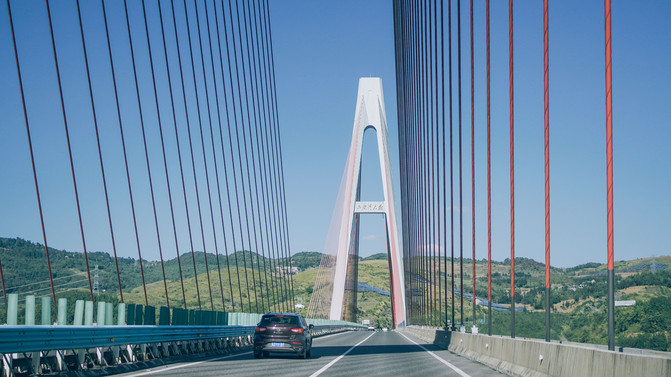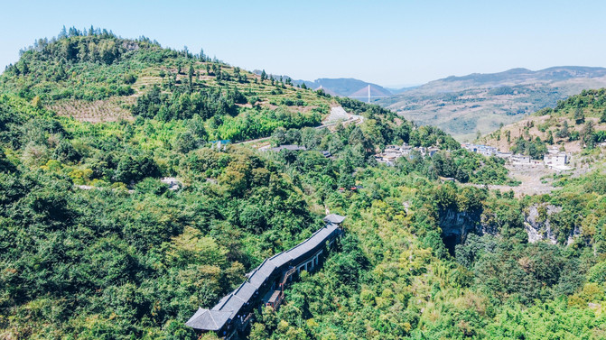 穿过连廊,换一个视角看看这里的风光。我们在一座又一座的大山中穿行,树木郁郁葱葱,若隐若现的峡谷看不见底部。