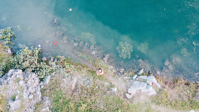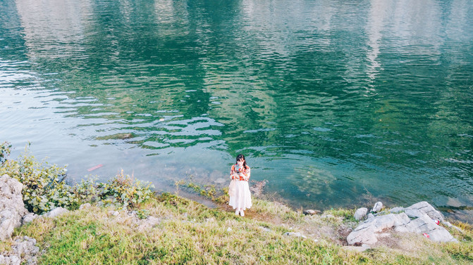 当太阳开始西斜,日光的橙黄变的更为明显。顺着光的方向看去,山脉被掩映的橙红,倒映在水面。这些石块上斑驳的画面啊,就好像连绵多少里的岩石壁画。