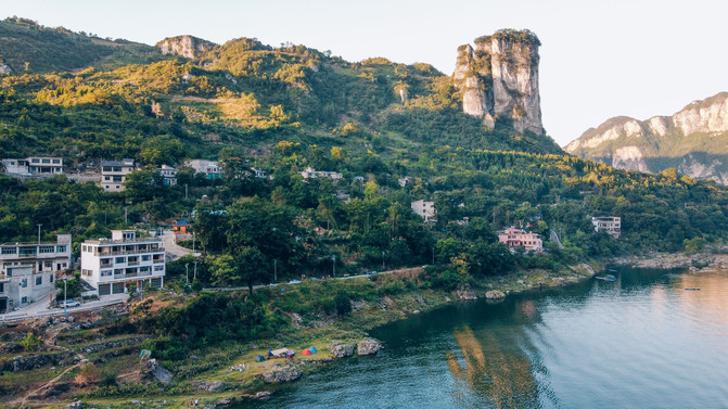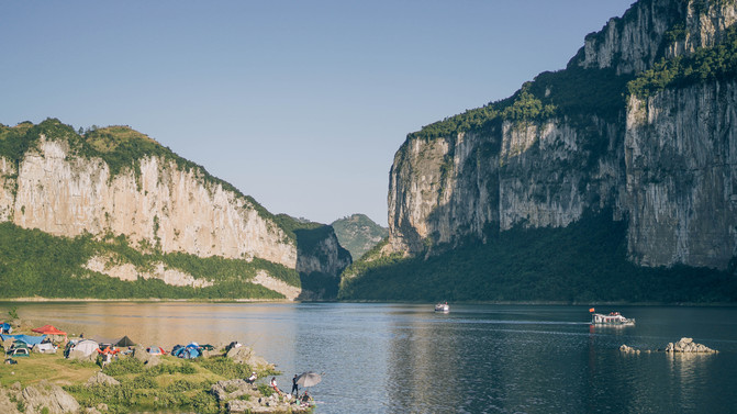 终于到了化屋码头,在这里可以选择乘船游览乌江源(60元一位,游船时间约1小时)。但更多的是当地人,带着帐篷、野餐垫和烧烤食材,在这里野炊,等落日和夜幕降临。