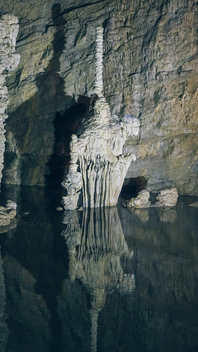 溶洞、石笋、水流,淡淡的水波痕倒映着这一个个神奇的造型。