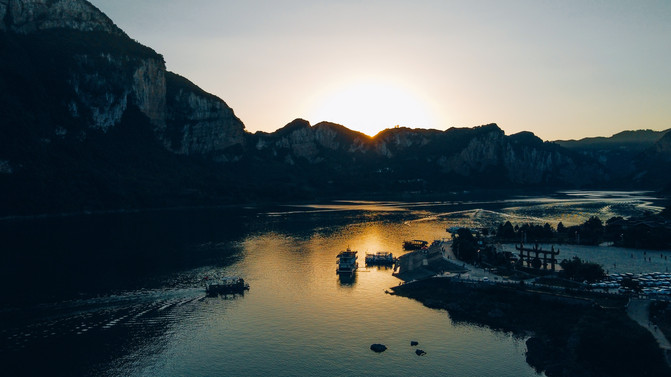 再晚些时候,太阳落到了山脉下方,余晖照着湖面,远航的游船也都慢慢归港。