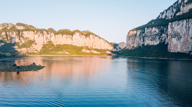 湖水清澄,倒影沉碧,宁静秀丽,两岸峰壁险峻,气势恢弘,且多瀑布山泉跌落湖中,是千里乌江上最美的崖壁画廊。