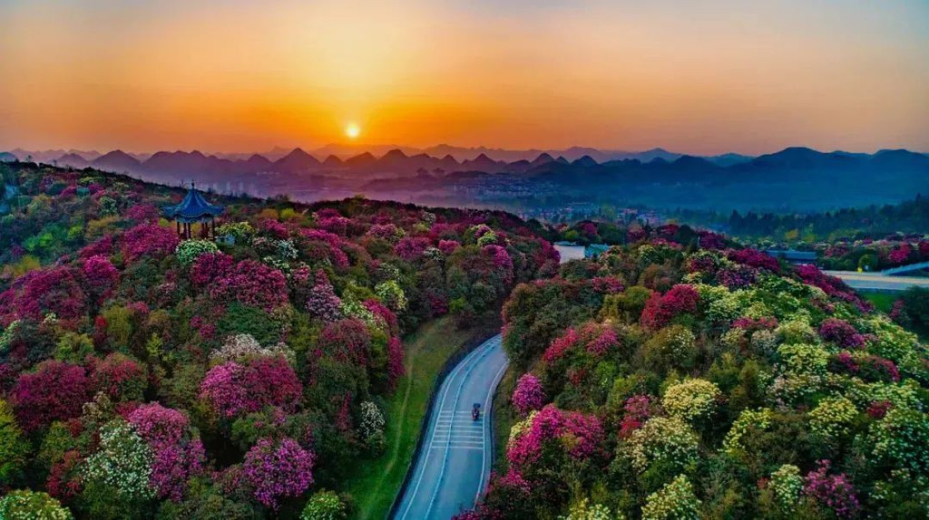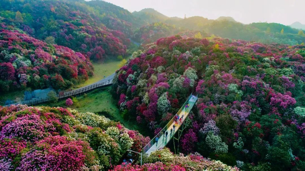 从暮春3月下旬开始,一场杜鹃花的盛宴逐步开启,各色杜鹃花竞相怒放,一片色彩缤纷,犹如广袤的锦缎华章铺山盖岭,令人目不暇接。