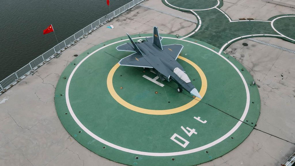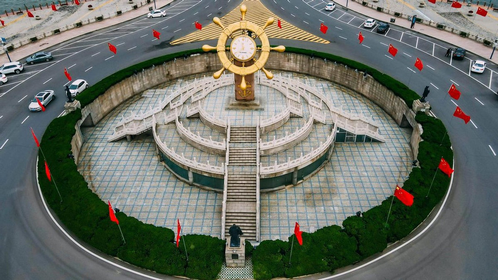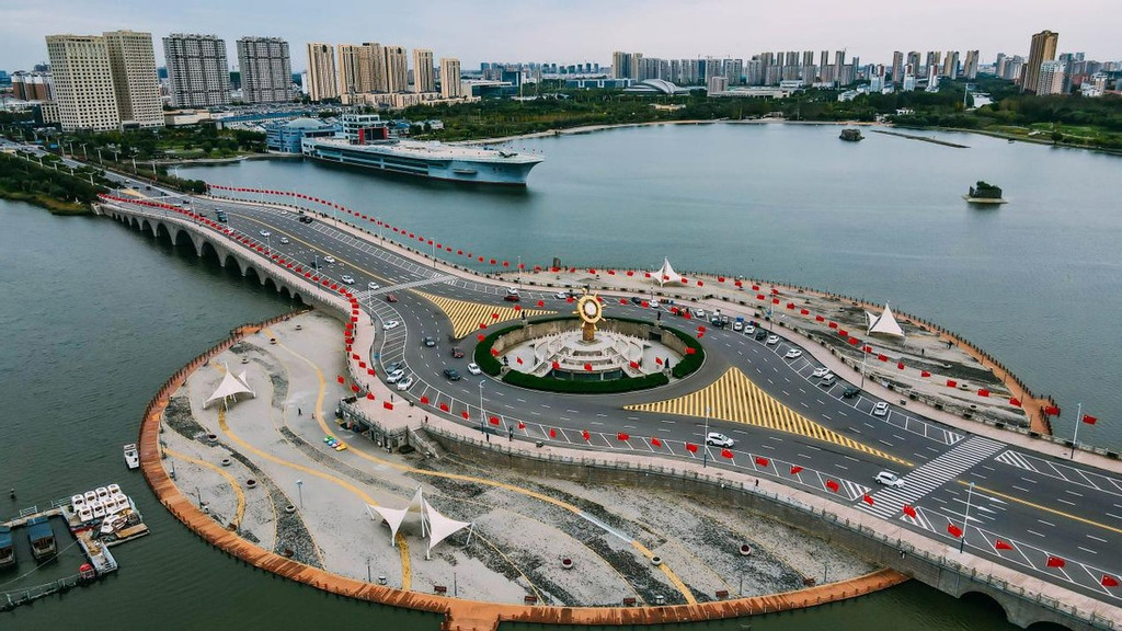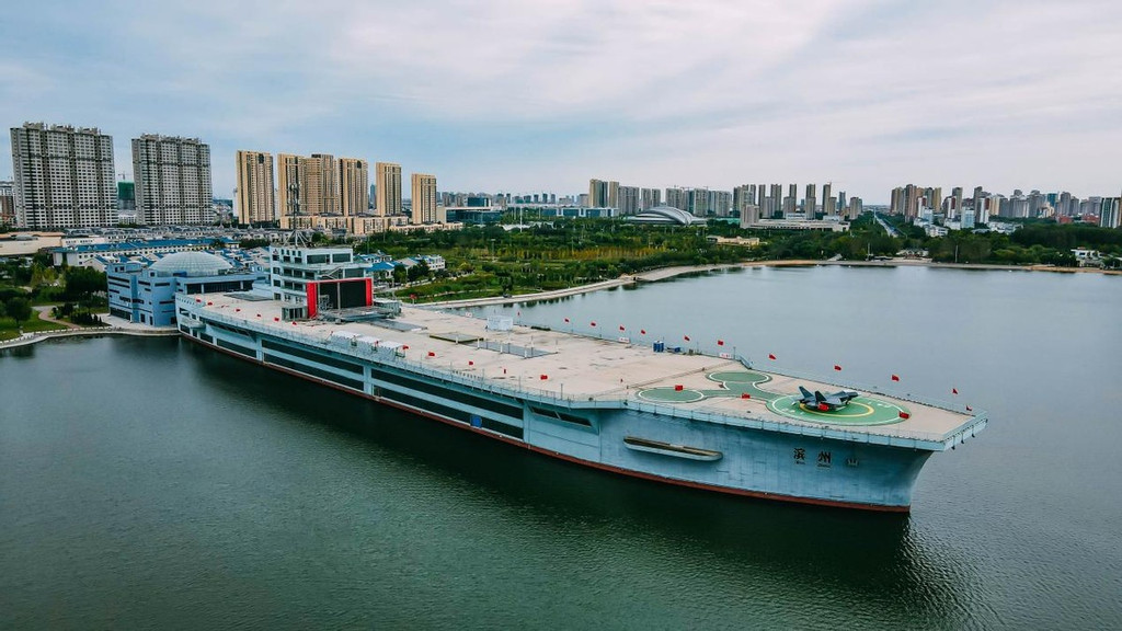 不远处水面上巨大的"滨州号航母"也是这里的一道景观,第一眼看上去你一定会以为这是一艘真的航母,一半已经探出水面,就像是准备远航。其实这艘"航母"是以美国尼米兹号为设计蓝本,一比一打造出的模型,是集休闲娱乐、饮食餐饮为一身的娱乐中心。