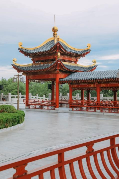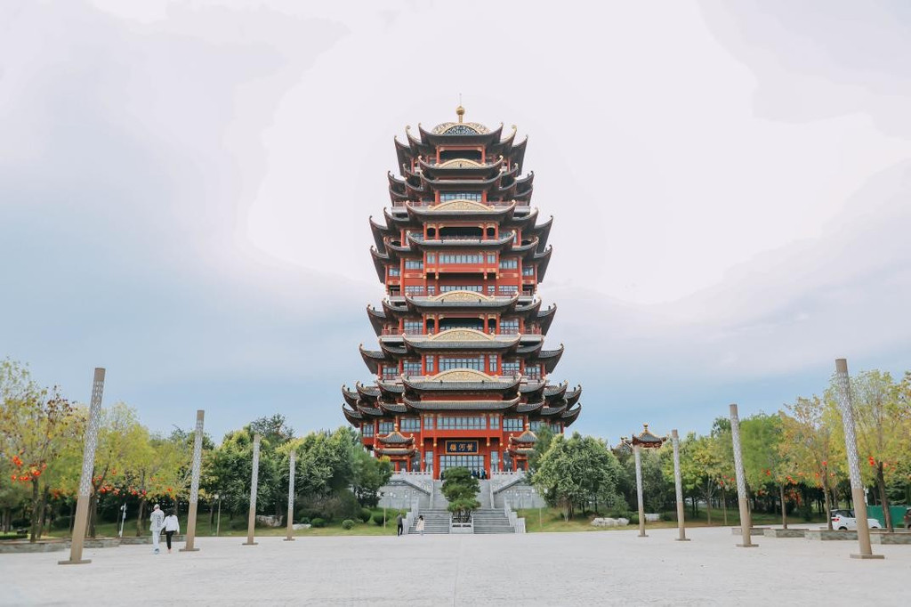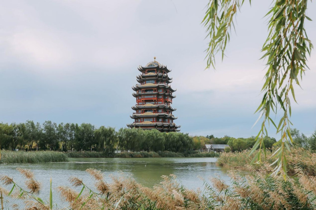 吃饱喝足后,就继续今天的旅程。黄河楼位于滨州蒲湖公园内,集观光旅游、黄河文化展示、书画工艺品展销于一体,是滨州乃至黄河三角洲地区的地标性建筑。黄河楼主体建筑地上12层,地下1层,楼内设计9个明层,9重古建筑带斗拱起翘的屋檐,寓意黄河99道弯,流经9个省市自治区,在山东流过9个市。设计者把古建筑的卷棚元素穿插在每层的挑檐中,既消除了层层挑檐的单调,同时巧妙利用了卷棚的弧线特点,在上挑的檐角处,用浪花取代了古建筑的吻兽,从而产生“黄河之水天上来”的效果。登上黄河楼,可南观黄河,北瞰城区,亦能欣赏地上悬河穿城而过的靓丽景色。