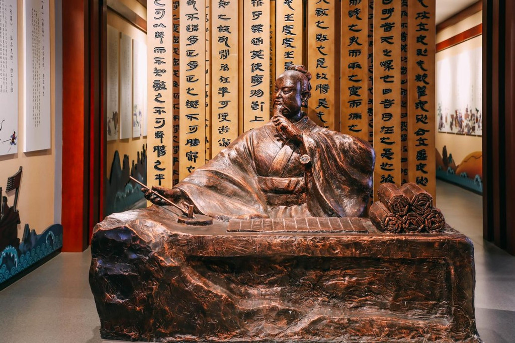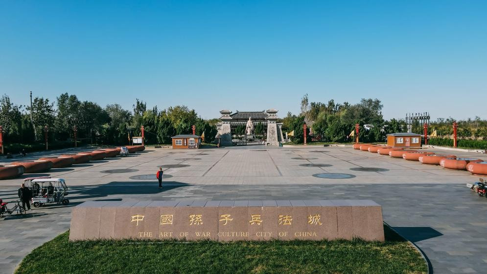 进入孙子兵法城,首先映入我眼帘的是孙子的石像,通体由灰白色的花岗岩雕刻而成,底座上刻有“武圣孙子”四个大字。