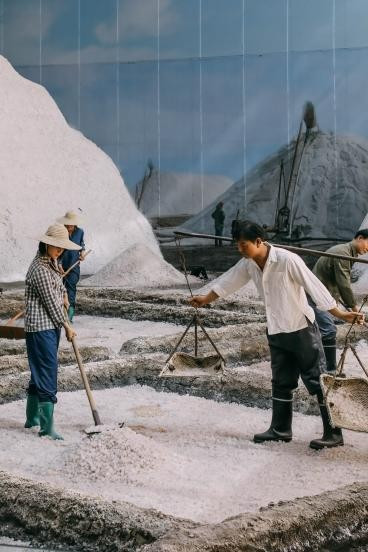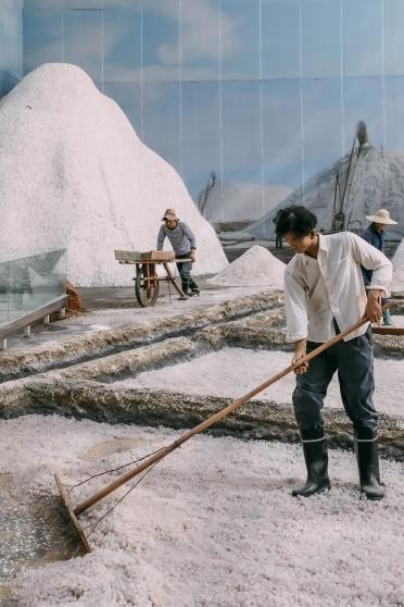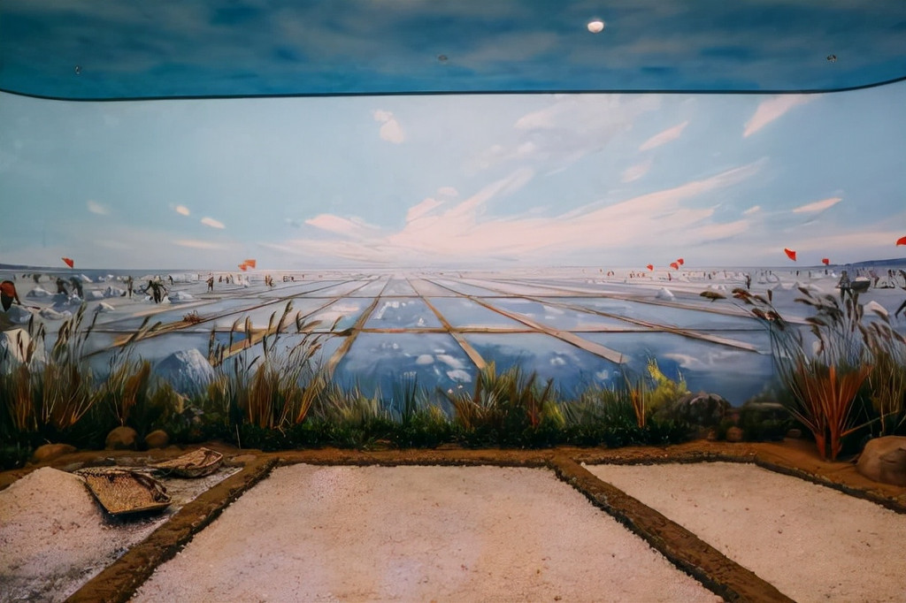 进入展厅,哗哗的海浪声与深蓝色的光影交相辉映,展现了先祖“煮海为盐”的历史文明,博物馆以“翔实的内容、艺术的构思、高科技的手段、互动的参与、丰富的场景体验”为特色,通过运用三维、动漫、场景复原等多种形式,再现了古代海水熬盐工艺和现代海水滩晒制盐工艺场景,让游客身临其境。