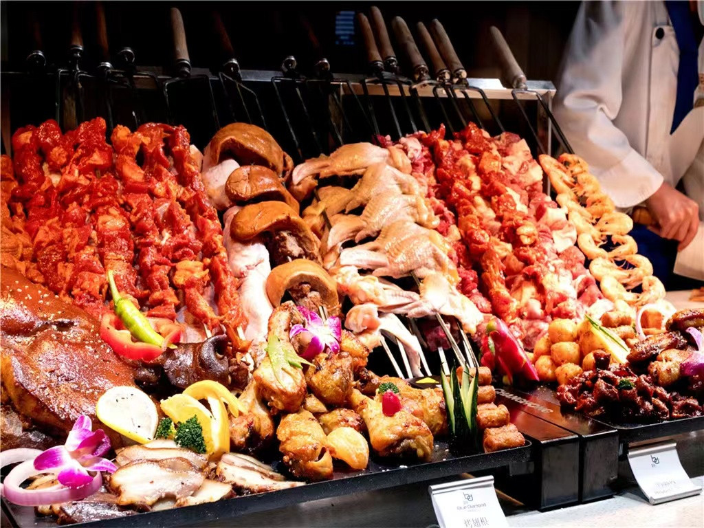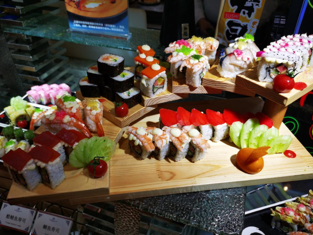 在酒店一楼是自助餐,种类很多基本可以满足众多人的口味,价格也很经济实惠,各种丰盛的食物也足以让小朋友享受一个美好的晚上。晚餐的食物很丰富,有烤鸭、牛排等各种肉类,也有各种海鲜,当然啦,小朋友喜欢的蛋糕和披萨也不会缺少,各种丰盛的食物让夜晚变得丰富而多彩。