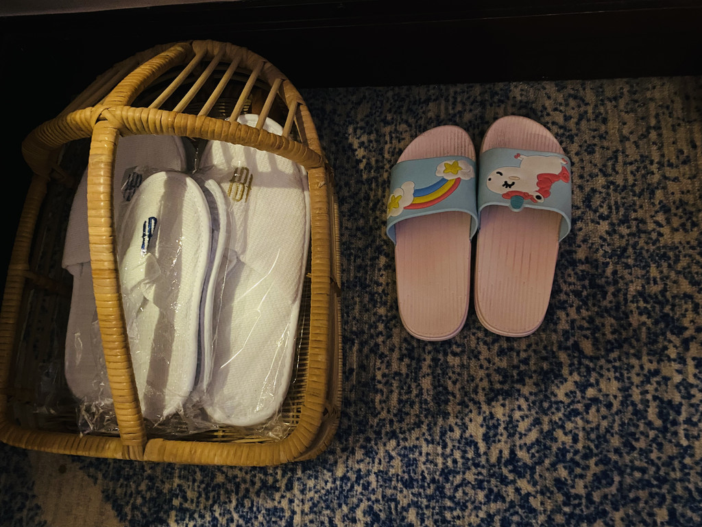 我们订的亲子房,与以往不同的是房间布置很温馨,进房间就看到有欢迎水果,种类很丰富除此之外有专门的儿童玩具,儿童mini拖鞋,卡通漱口杯,给酒店点个大大的赞。