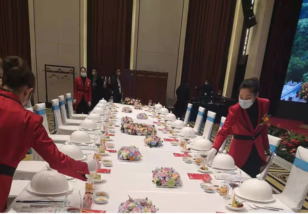 我们的会场是在二楼的御华厅,整个大厅采用无柱设计,层高八米,大厅顶部采用水晶吊灯,可进行多种灯光变换,视觉超赞。会场形式采用长条桌布局,足足可容纳200多人,旁边还有大部分空档空间可以使用。整体的会议流程走下来,融洽的氛围加上惬意的会议环境给我们带来极为舒适的年会体验感。如果你们企业还在对年会会场选择还在犹豫不决,我建议您可以选择蓝海御华,值得信赖!