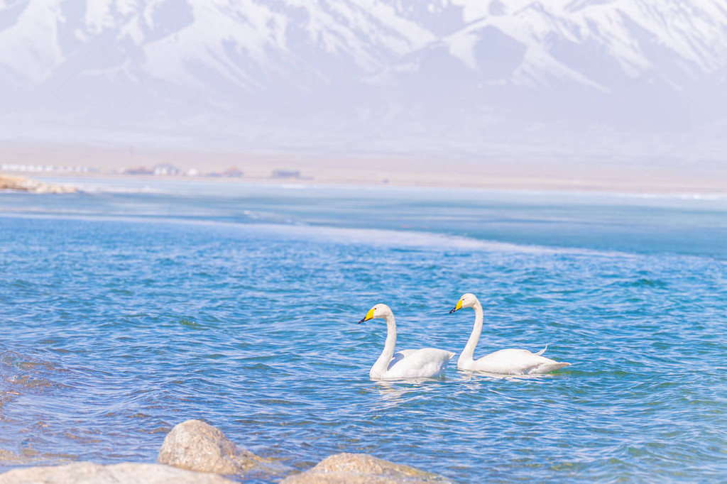 顺时针过了南门后,就是西海天鹅湿地草甸水体栖息地,这里有一股暖流从草原渗出,于是始终有一片不结冰的湖湾,这便是传说中的能看天鹅的地方。绝大部分的水域冰封着,天鹅也不想飞,就成双成对地待在这片温暖的水域。景区的人说,待湖冰全化了,人也多了,它们就飞走了。