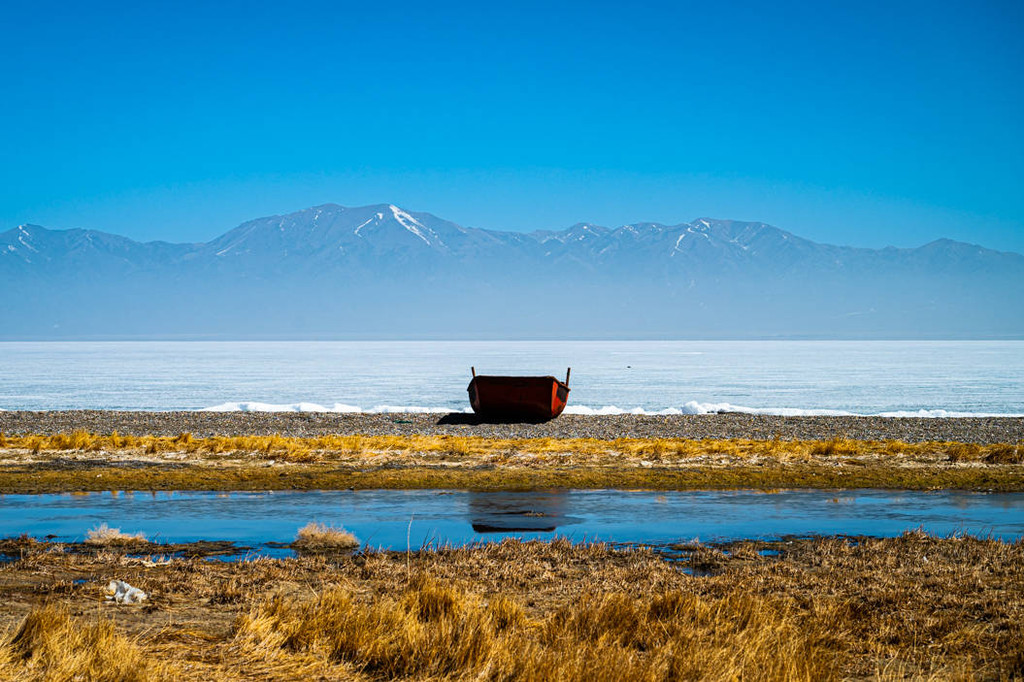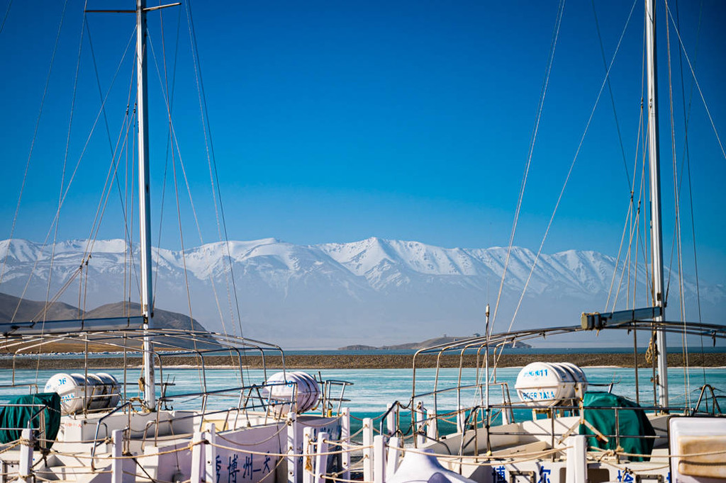 可是新疆防疫政策很严,时时调整,从伊犁过去虽然不远,但前两次车到赛湖东门口,都因为防疫政策不达标,被劝返。第三次通过了入园条件,但还是不允许在景区内住宿。东门现在是赛湖唯一的入口,也就是早年入园的月亮湾区域,大部湖面冰封,近年新增的一批游艇还被冻在码头。
