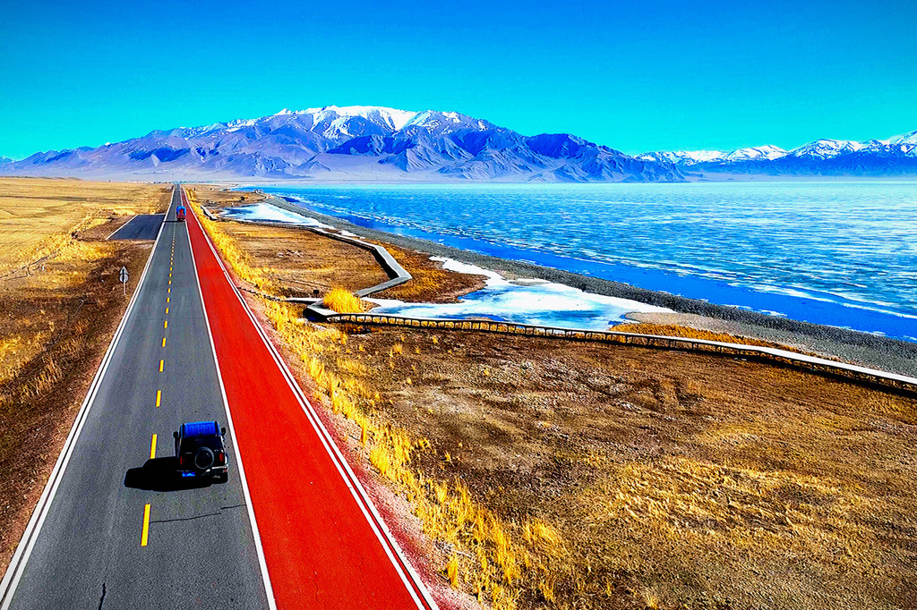 环湖的土路改油路了,靠湖的一侧是彩色的骑行带,环湖一周大约70公里,根据我的规划,建议东门进,顺时针方向开,刚好右边是湖,沿着无敌湖景开开停停,东门出,一天刚好。如果东门进南门出逆时针方向,出来刚好是果子沟大桥观景点,但车靠内道,同时错过了东边一段紧挨的湖景。当然,有时间的话可以顺时针方向,东进南出,多走一段东边的路段。