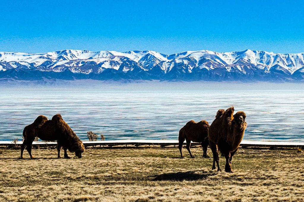 过了塞北堡,就是湖区的东北岸了,这里向南可以看到绵延的雪山,有许多没有游客的临湖游步道,被称为“十里长堤”,听说附近有一片野生郁金香,还有牌子“郁金香观景区”,现在正是高原野郁金香盛开期,可是怎么也找不到,是不是被这一群不知好歹的骆驼给吃完了。