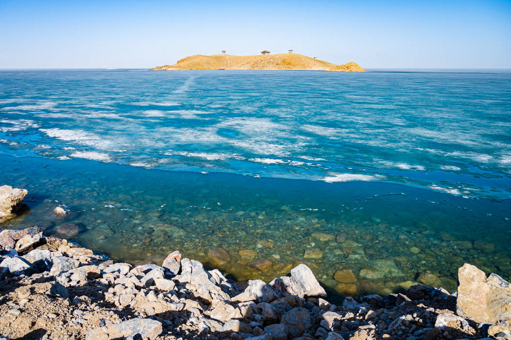 东南这一段是我以前没有经过的,公路紧挨湖岸,基本上与连霍高速并行,靠近湖岸的冰面局部开始融化,清澈的湖底露出卵石,发现湖中还有一个小岛,以前没看到,也没人告诉过我。