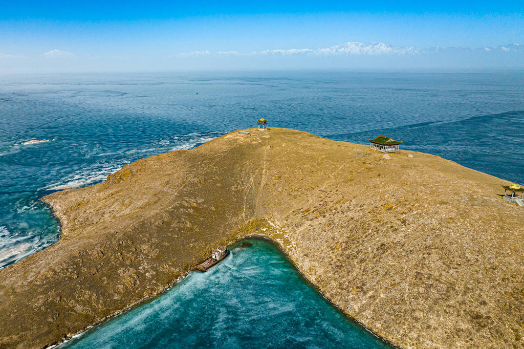地图上说叫湖心小岛,从空中看呈海星状,被冰封得死死的,绿草还没有复苏,岛上有三座亭子,一座汉传风格,两座少数民族风格,可以看到有一艘被冻住的船,大概是解封后的交通工具吧。