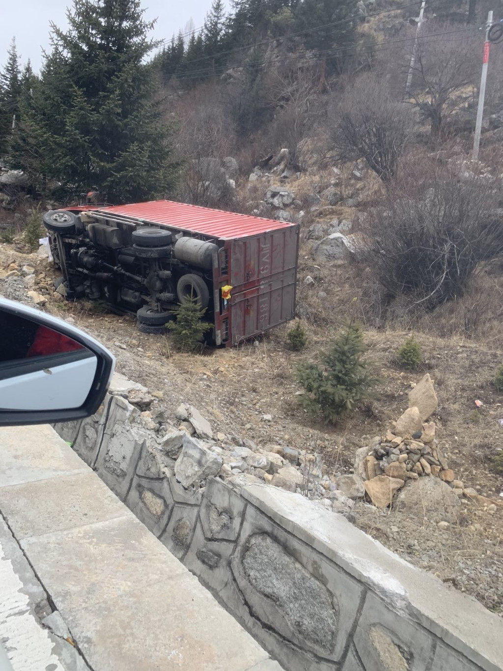 途中看到一辆侧翻的卡车,担心的过去看看驾驶室,还好里面没人,也没有血迹,应该已经走了
