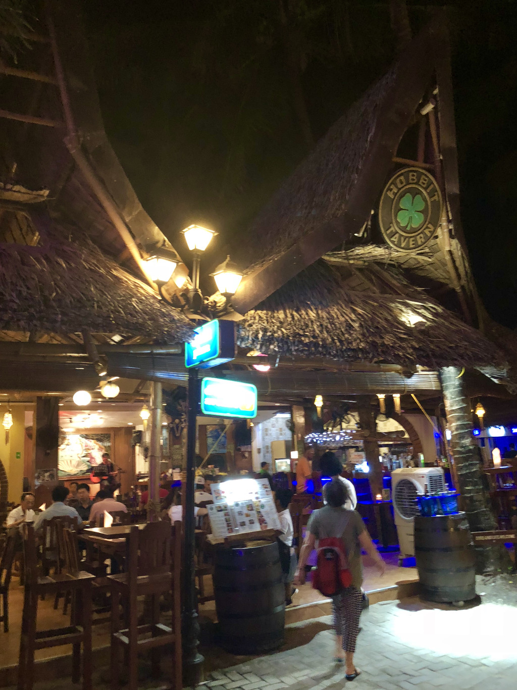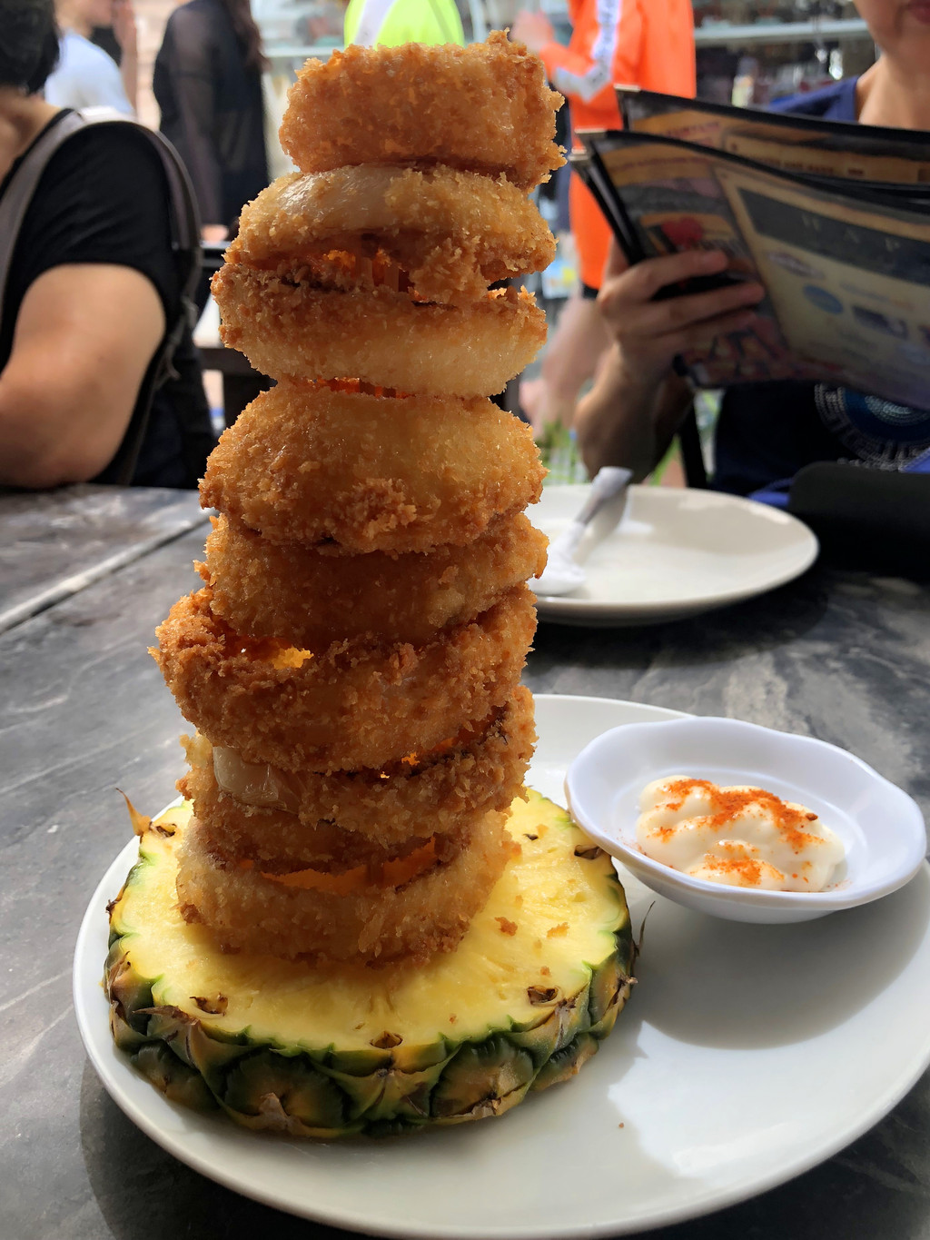 这也是一家长滩岛的网红餐厅。网上介绍需要预约、排队。我们中午去的,因为是一行9人,空位不够,让我们等一二十分钟,留下等位的人,其他人继续逛周边小店。最多20分钟吧,入座点菜。当然会点推介度高的洋葱塔、蘑菇蒜香牛排、猪肋排,选了炭烤海鲜组合和有人推荐的烤香肠,还点了蔬菜沙拉,味道都不错啊。鉴于前一天在霍比特人吃烤鸡吃到撑的经历,不想点烤鸡的,但炭烤海鲜组合里有烤鸡,不过这次由于鸡肉不多还味道不错,很快解决。烤香肠甜甜软软的味儿不错。点了生力皮尔森啤酒佐餐。