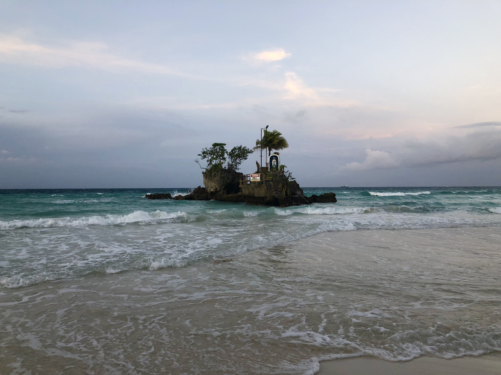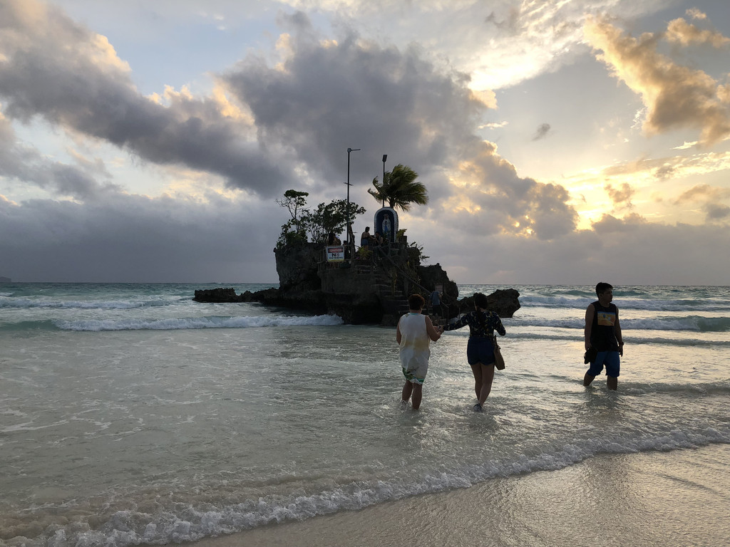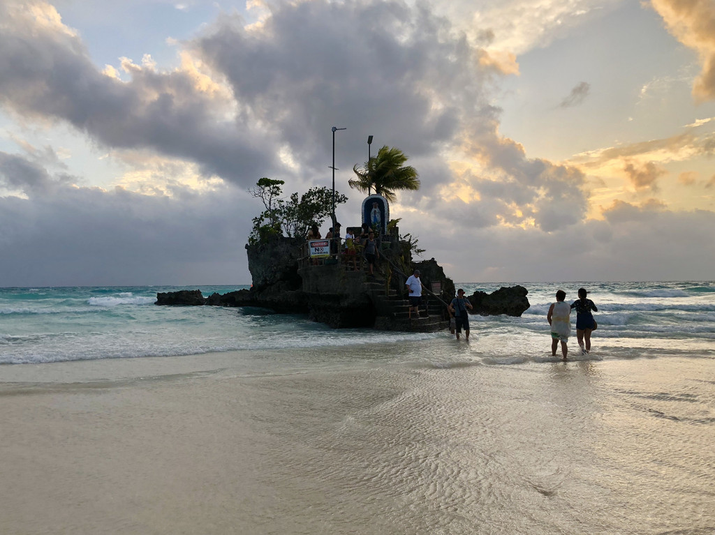 圣母礁岩是长滩岛有名的礁岩,矗立在海中,当地的居民在上面供奉了一尊圣母像,所以取名圣母岩礁。登上礁岩,可以回望白沙滩,也可以眺望大海,是长滩岛白沙滩上的标志性景点,也是拍照留念的好地方。退潮时候可以直接走到礁岩处。