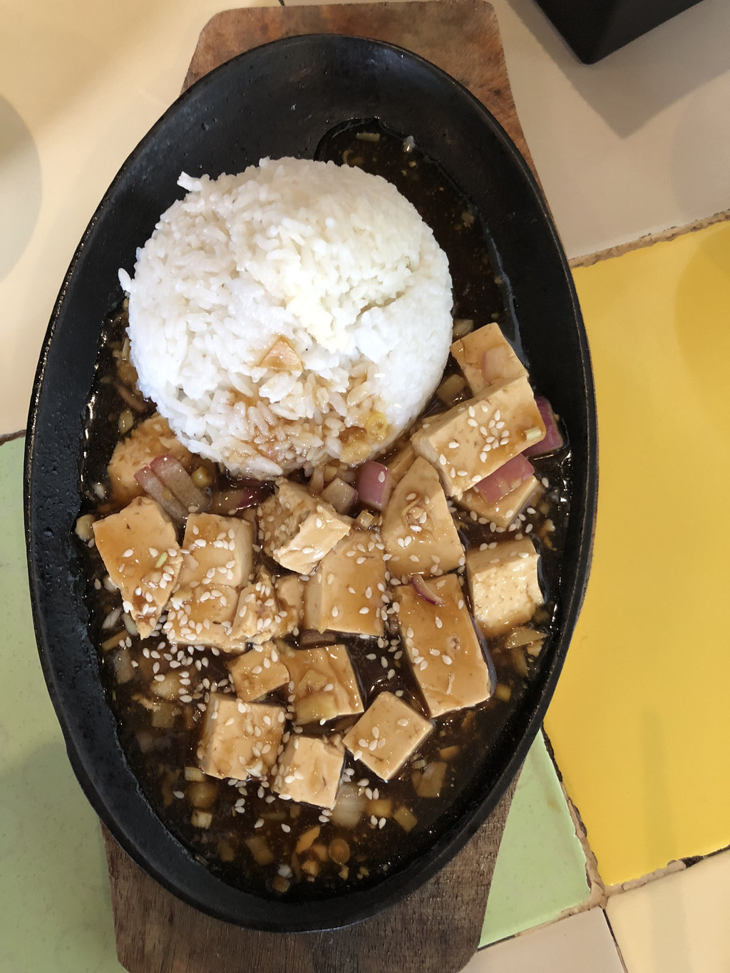 我们在楼上进餐,还是基本照推荐菜点餐,前三的菜品都点了(牛骨汤、铁板蘑菇牛肉饭、铁板焗虾),招牌牛骨汤确实肉烂汤浓。另外点的几个菜、饭大家都喜欢,香辣茄子鸡肉饭和鱿鱼饭都好吃。其他店除了蔬菜沙拉青菜都很少,这家店的空心菜、青菜炒得都好吃。