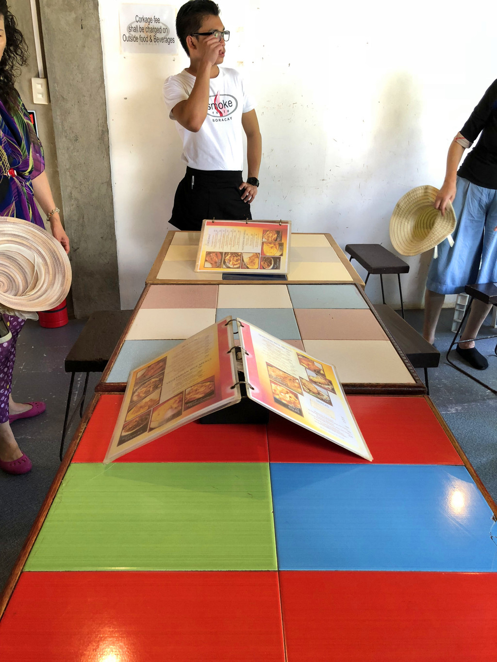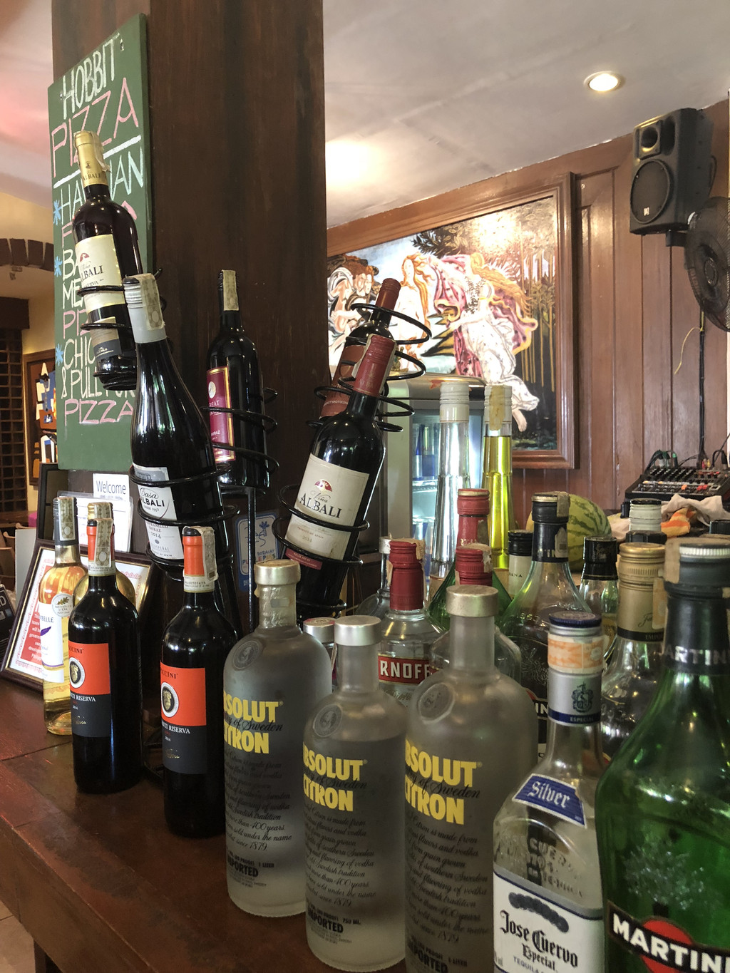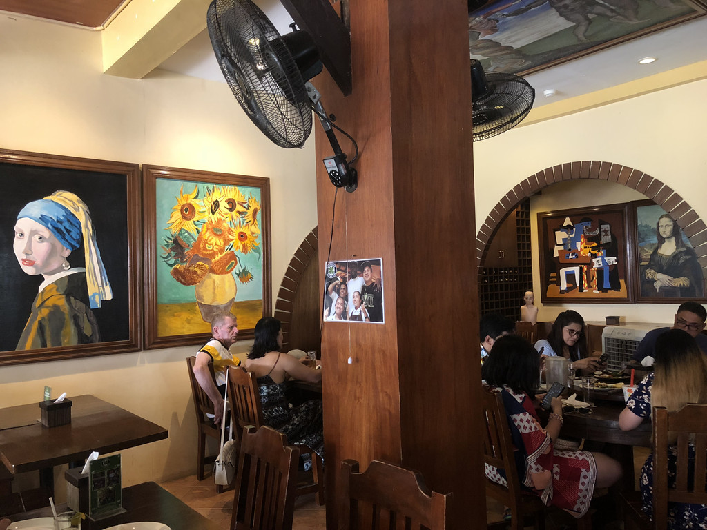 这家店是长滩岛的网红餐厅,去之前就打定主意一定要吃到的。到长滩岛的第二天就去了。怕晚上没座儿,下午提前预定好。海边看完日落走过去吃晚餐。餐厅装饰古朴,墙上名画“赝品”比比皆是。服务生很专业,服务很好。点菜基本按着网上推荐菜走,当然少不了点岛上美食:烤鸡和特色披萨,还有菲律宾生力啤酒。菜品啤酒味道都好,只是服务生说我们人多要点一只烤鸡,这一只烤鸡吃到撑,味道又淡,要了胡椒和盐,本着不浪费的精神合力基本吃完。