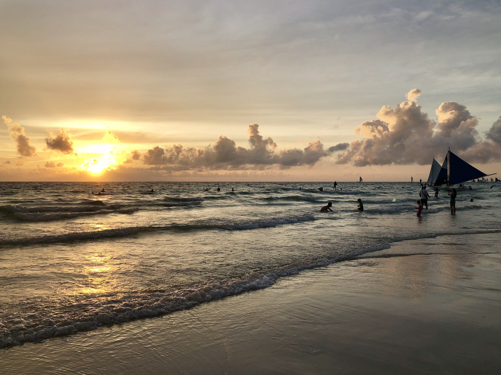 落日风帆可以算是长滩岛最著名的景观。你可以在沙滩上观赏有风帆衬托的海面落日,也可以乘坐帆船在海面行驶中欣赏落日。我们选择了前者。如果没有海面的风帆,落日就是普通的大海日落,而有了风帆,真的很美很美……