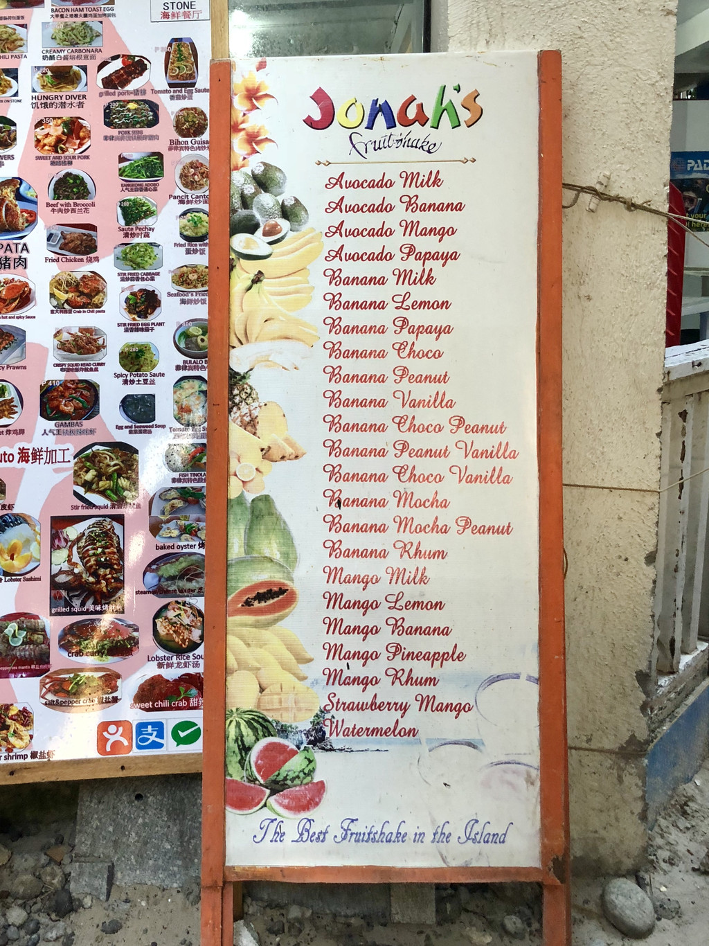 从星期五沙滩一直走到1号码头,问了几个当地人在小巷里找到了被推荐为白沙滩上最好喝的芒果冰沙的Jonah’s。168比索一瓶的芒果冰沙装在矿泉水瓶子里,盖上插了纸吸管,管子短于瓶身,不小心就会滑进瓶子里。我一拿瓶子就沾了一手果汁,店里说没水洗,只好在他们的湿布上擦擦,也就忘了拍瓶子图片,味道就是芒果汁,真的好失望。