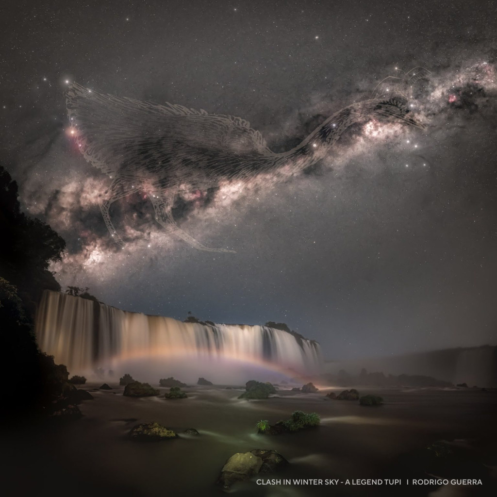 2025年,一幅拍摄于伊瓜苏国家公园的作品赢得拉美颇具影响力的摄影节“巴西利亚摄影展”(Brasília Photo Show)的星空类大奖。这幅名为《Ema — 瓜拉尼传说》(Ema – A Guarani Legend)的作品,完美融合科学、艺术与原住民精神信仰。画面呈现伊瓜苏瀑布上空的星河,其中勾勒出鸸鹋(rhea)的轮廓——这种神话生物正是瓜拉尼人的图腾象征。